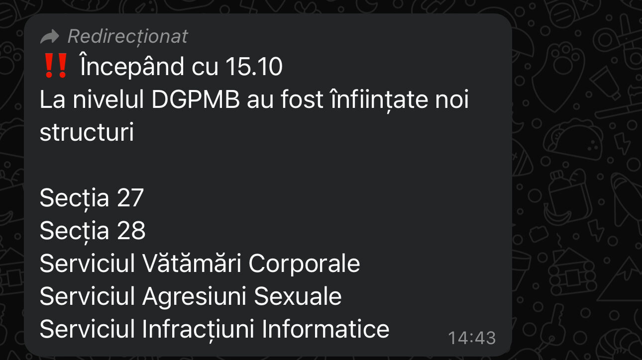 Reorganizarea Poliției Capitalei anunțată pe WhatsApp ridică ingrijorări majore