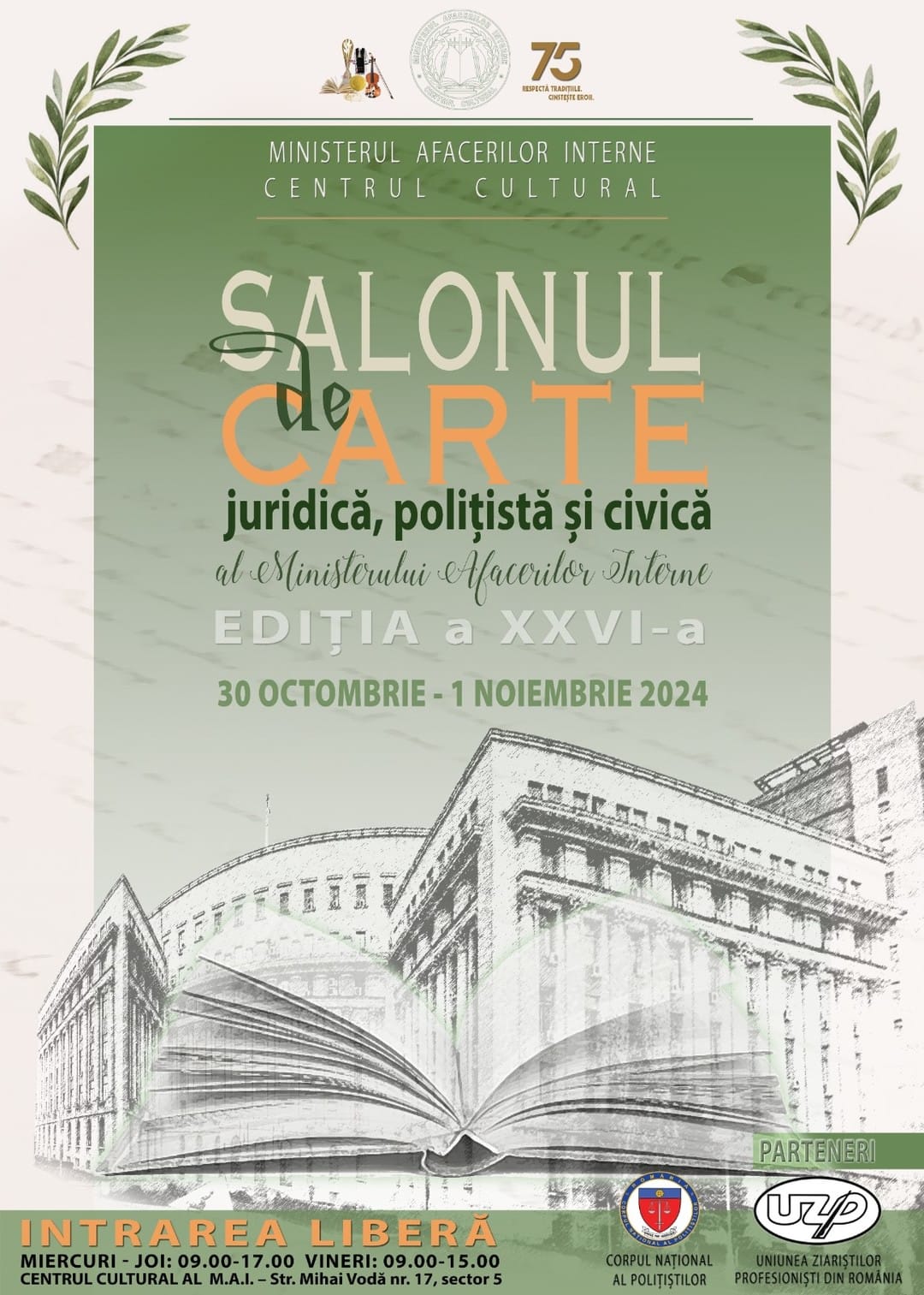 Cu sprijinul organizației profesionale Corpul Național al Polițiștilor, partener alături de Uniunea Ziariștilor Profesioniști din România, Salonul de Carte Juridică, Polițistă și Civică al Ministerului Afacerilor Interne își deschide porțile!