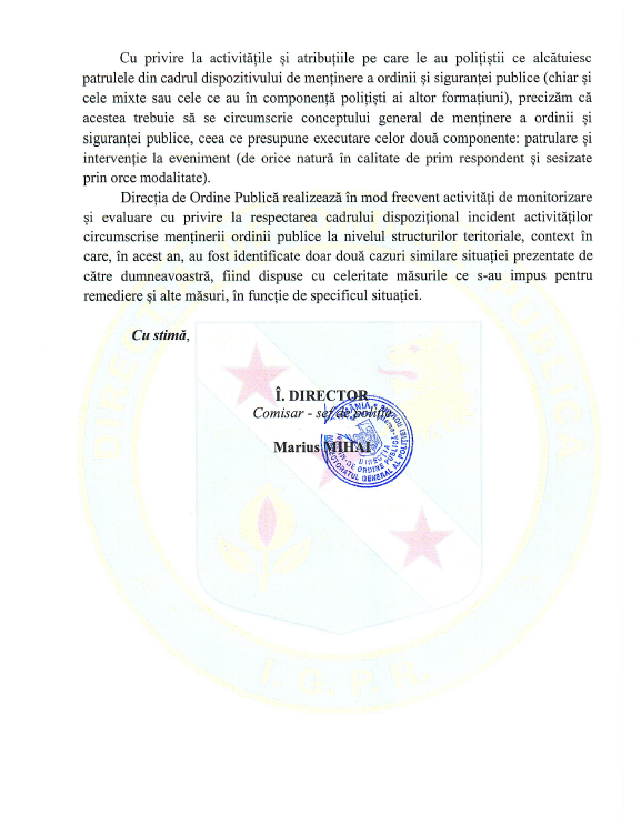 Sindicatul a solicitat clarificări de la Direcția de Ordine Publică privind aceste probleme de personal și subdimensionarea funcțiilor, primind confirmarea că situația este cunoscută, dar fără un plan clar de remediere. S-a accentuat că activitățile desfășurate de lucrătorii din dispozitivele de ordine publică trebuie să se concentreze pe menținerea ordinii, dar pe teren acest lucru nu se întâmplă din lipsă de personal adecvat.