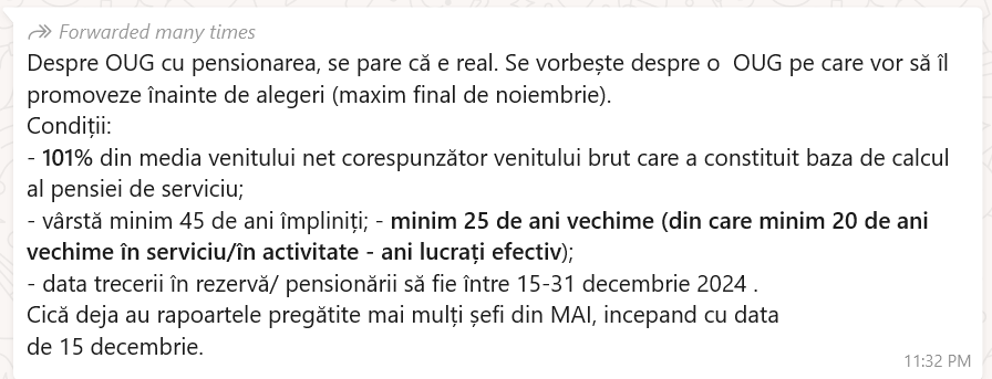 „Când dorința întunecă rațiunea, apar mesaje furibunde și false, cum este și cel din foto, care circulă cu mențiunea „Forwarded many times”. Cum puteți să credeți așa ceva?”, întreabă Emil Pascut de la Sindicatul Diamantul. „Primesc de o lună de zile astfel de prostii pe WhatsApp, cum că ordonanța fantomă vine în mare secret, doar pentru cunoscători. Vă întreb ce satisfacție bolnavă are cel care le scornește.”
