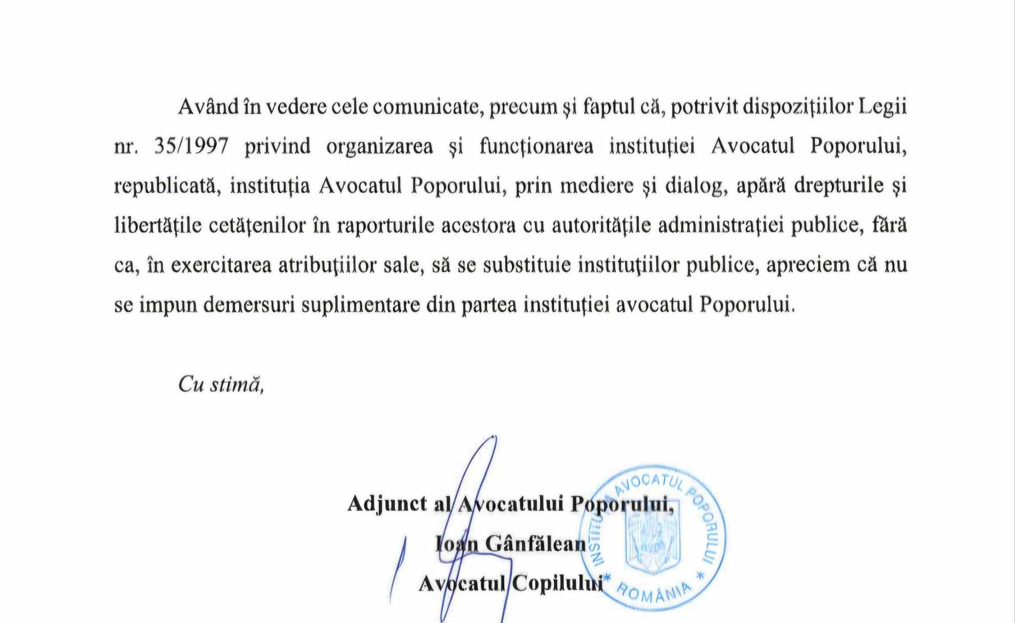 Sesizat de noi, Avocatul Copilului a băgat petiția în centrifugă și a pasat problema în curtea Poliției Române, care ticluiește un răspuns semnat de însuși chestorul Benone Matei. Dincolo de balastul cu care ne obișnuiește Poliția Română să-și ambaleze opacitatea în comunicare, observăm că chestorul Benone Matei confundă ceea ce se cheamă ”competența în materie” cu ”specializarea”, culmea e că așa l-a îmbrobodit și pe Avocatul Poporului!