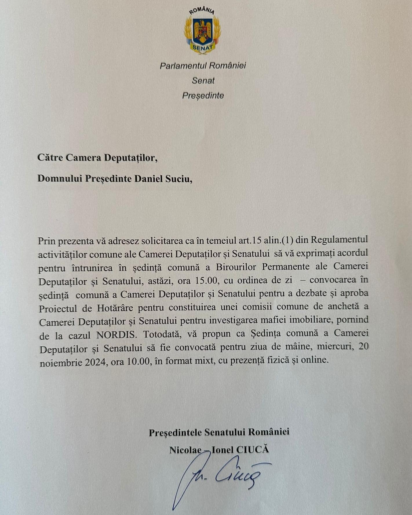 Nicolae Ionel Ciucă solicită convocarea de urgență a Ședinței Comune pentru a ancheta Mafia imobiliară Nordis