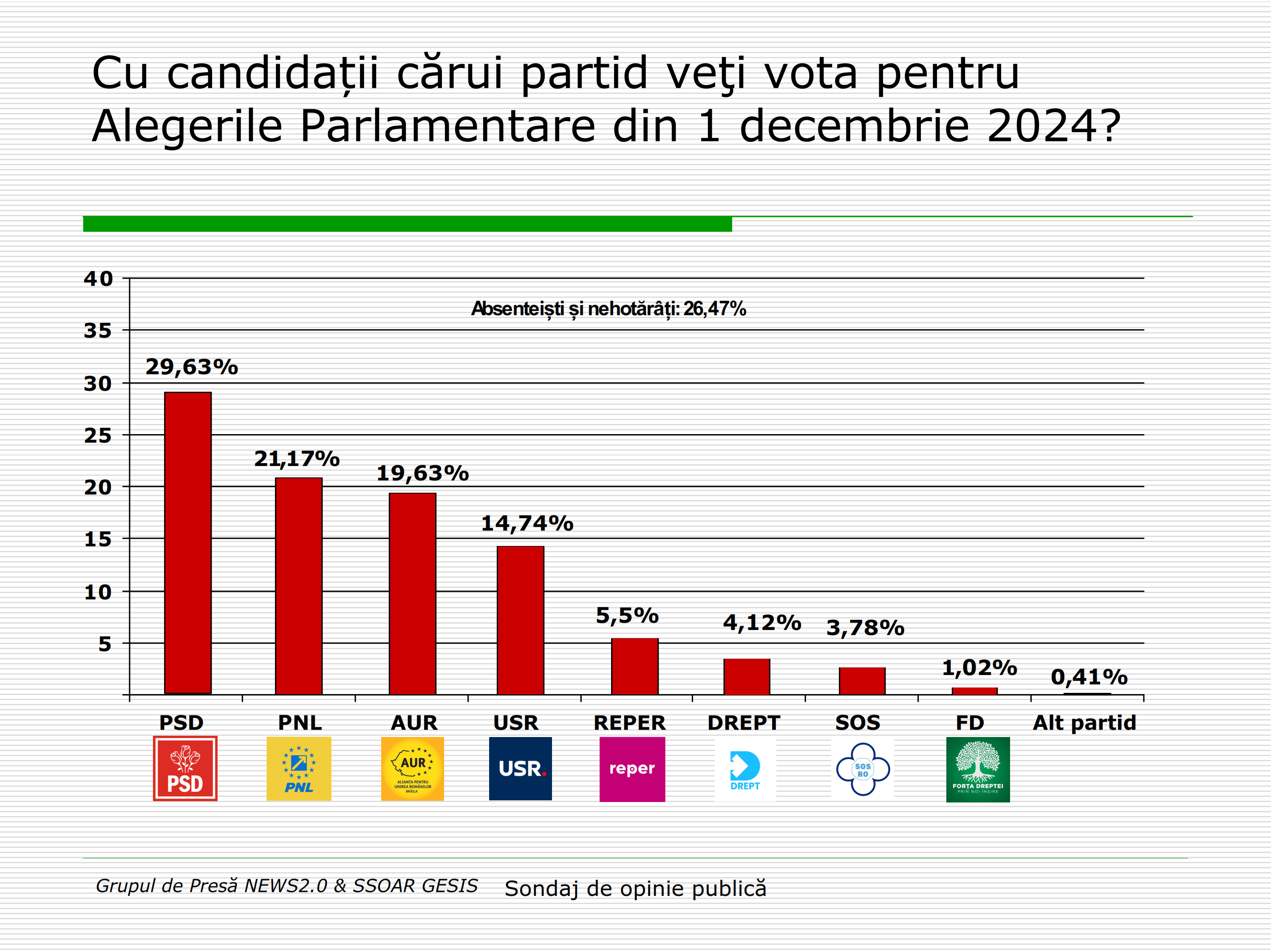 La coada clasamentului se află Forța Dreptei, partidul condus de Ludovic Orban, cu un procent de doar 1%. Această cifră este definitorie pentru traiectoria partidului, care nu reușește să crească în sondaje și pare să piardă treptat relevanța pe scena politică. Având în vedere această tendință descendentă, este puțin probabil ca Forța Dreptei să joace un rol semnificativ la alegerile din 1 decembrie.