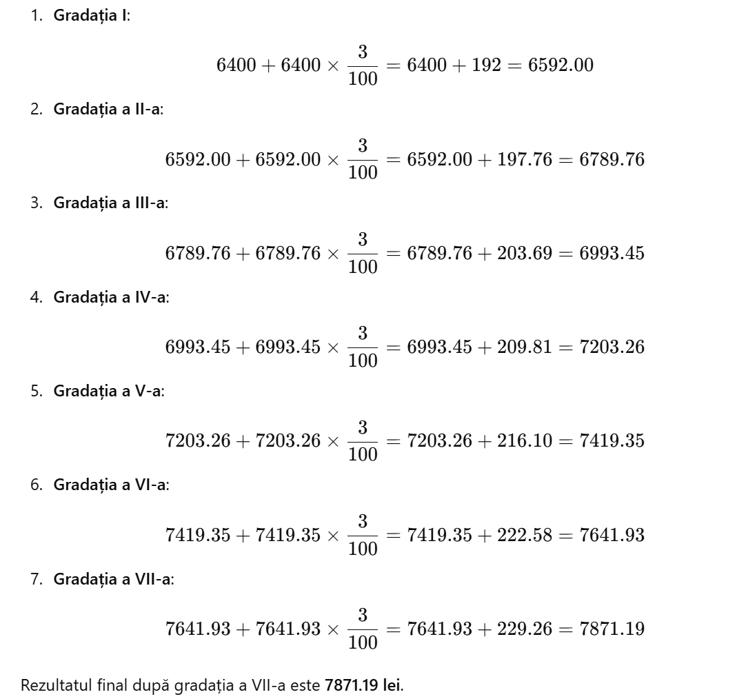 - Gradația a VII-a: 7642 lei + (7642 lei x 3%) = 7642 lei + 229,26 lei ≈ 7871 lei
