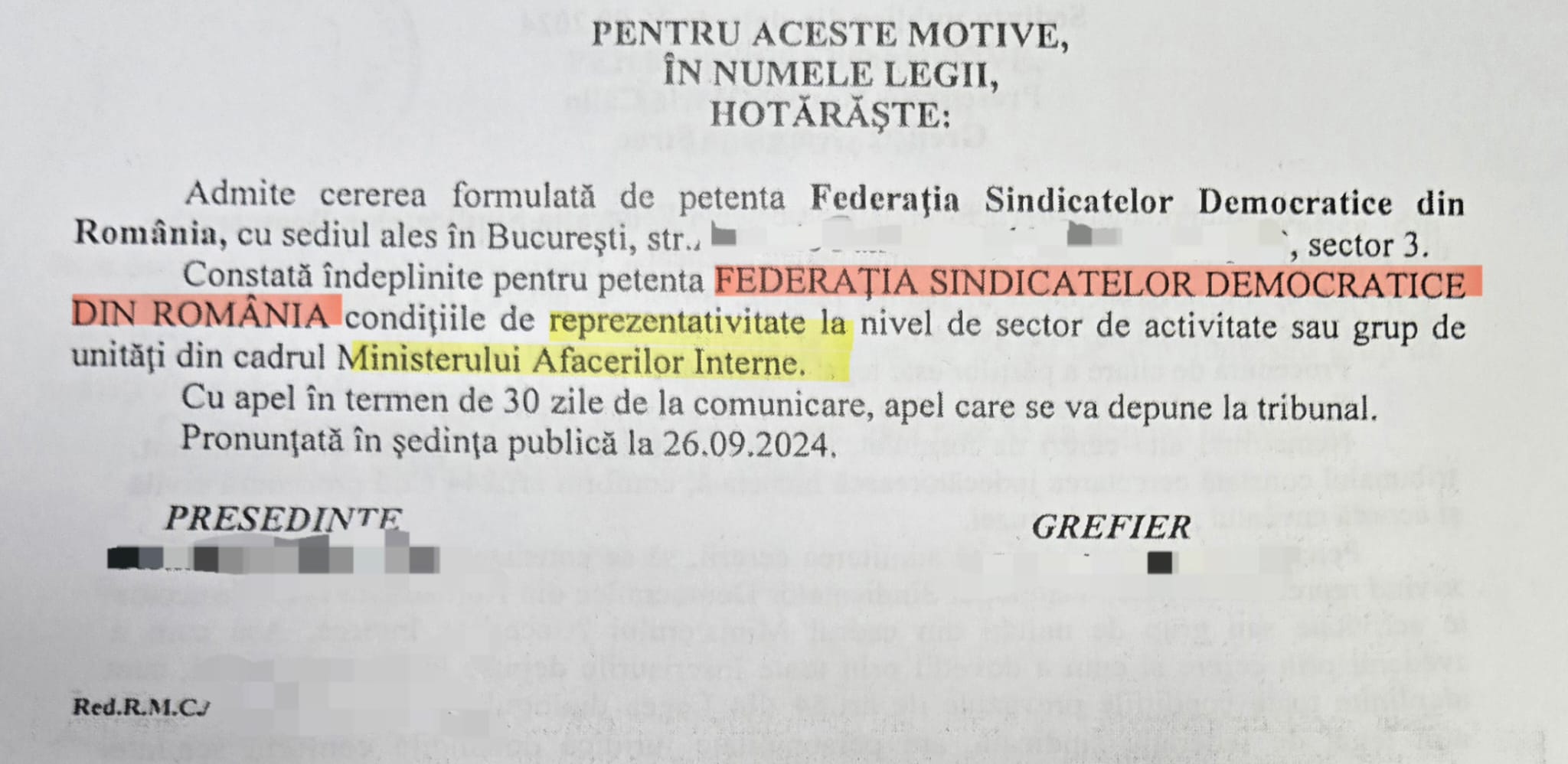 Pe 26 septembrie 2024, Tribunalul București a admis acțiunea formulată de F.S.D.R. prin Sentința civilă nr. 12/REP/2024, constatând că federația îndeplinește condițiile de reprezentativitate la nivel de grup de unități din Ministerul Afacerilor Interne. Aceasta s-a realizat datorită faptului că sindicatele afiliate, cum ar fi Sidepol (cu peste 30 de filiale și grupe sindicale), Meridian și Sidepol Olt, au atins procentul necesar solicitat de lege în raport cu numărul total de angajați.