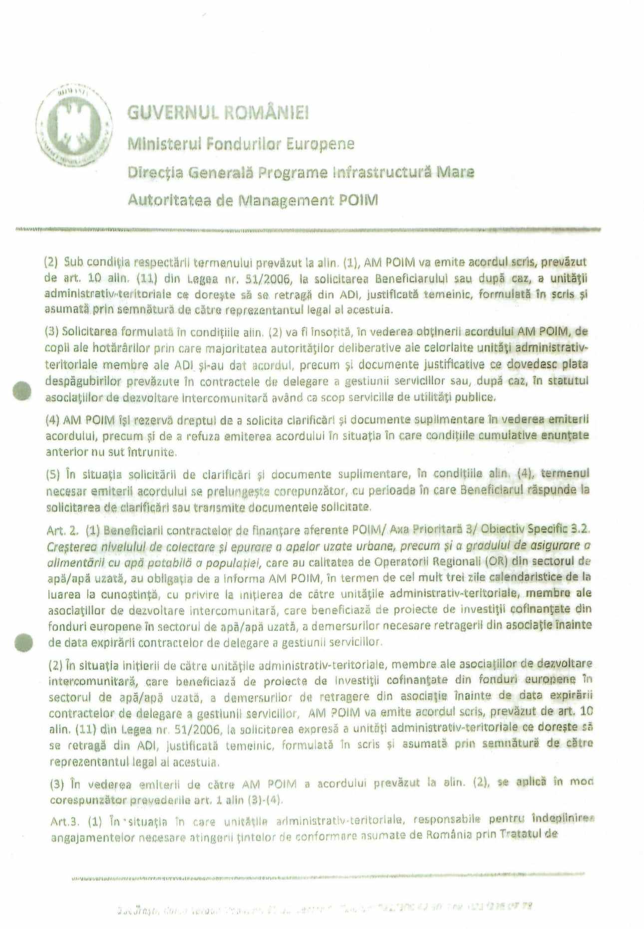 Conform Art. 10 alin. (11) din Legea nr. 51/2006: „Unitățile administrativ-teritoriale membre ale asociațiilor de dezvoltare intercomunitară, care au delegat împreună gestiunea utilităților publice aceluiași operator/operator regional, se pot retrage din asociație înainte de expirarea contractelor de delegare a gestiunii serviciilor doar cu acordul majorității celorlalte unități administrativ-teritoriale membre, exprimat prin hotărâri ale autorităților deliberative, precum și cu acordul scris al entităților finanțatoare, în cazul în care beneficiază de proiecte cofinanțate din fonduri europene.”