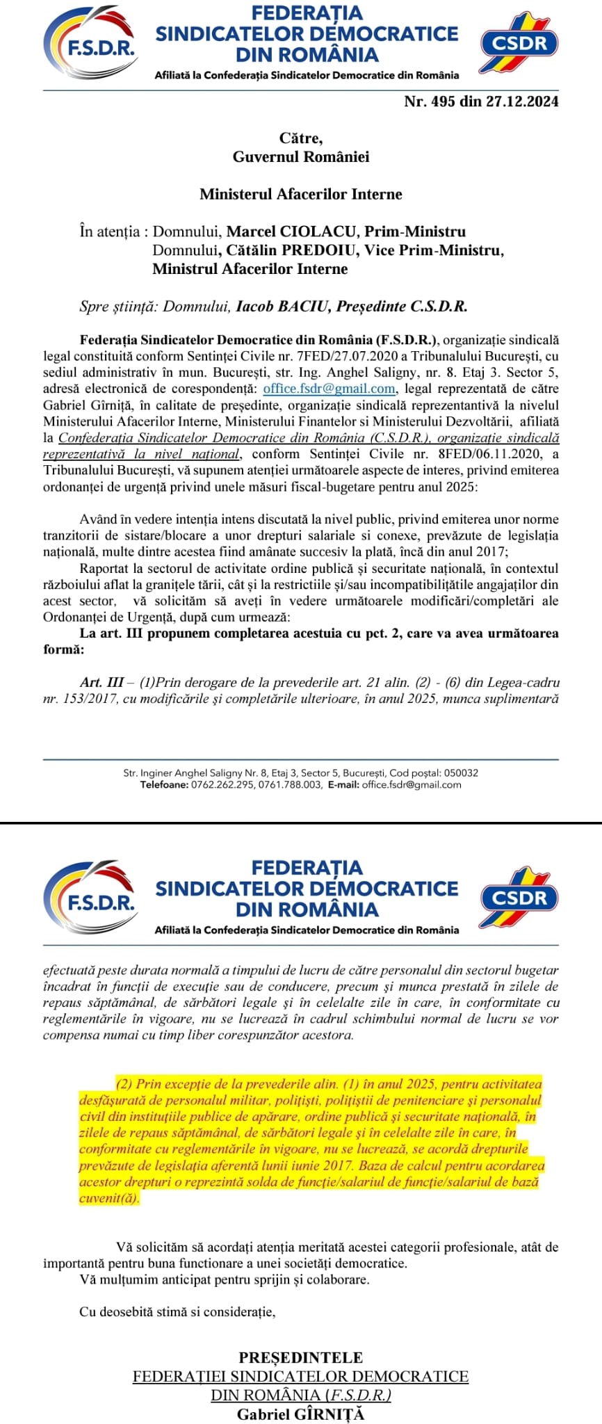 Organizația sindicală a transmis deja propuneri către factorii de decizie din Guvern și Ministerul Afacerilor Interne pentru a susține amendamentele referitoare la OUG, solicitând respectul cuvenit pentru sectorul lor de activitate. În cazul în care acestea nu sunt luate în considerare, se preconizează un debut tumultos al anului 2025, cu proteste de stradă și blocarea activităților, având în vedere și lipsa acută de personal și neplata orelor suplimentare.