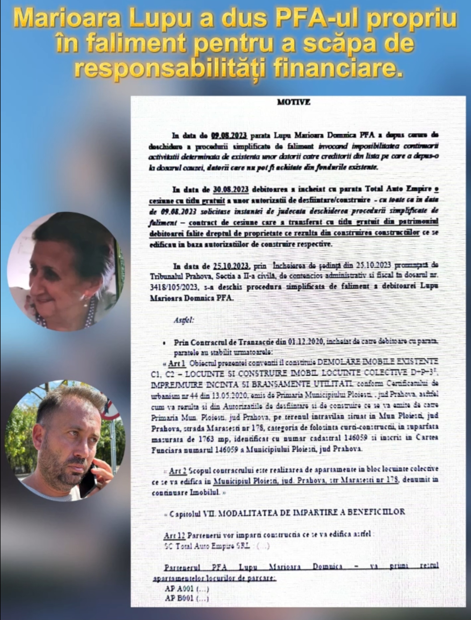 Scandalul imobiliar ce a afectat comunitatea din Ploiești continuă să dezvăluie nereguli, iar blocul de apartamente de pe strada Mărășești nr. 178 devine acum un nou punct de interes. Protagonistele acestei afaceri dubioase sunt Mihai Lupu și Marioara Lupu, a căror companie, PFA Lupu Marioara Domnica, își continuă activitatea în ciuda acuzațiilor grave ce o vizează.