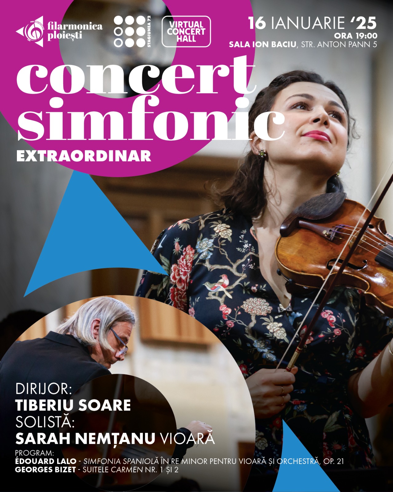 Te invităm joi, 16 ianuarie, de la ora 19:00, la Sala „Ion Baciu” a Filarmonicii „Paul Constantinescu” pentru un concert extraordinar. Violonista Sarah Nemțanu și dirijorul Tiberiu Soare se vor reuni pentru a oferi publicului ploieștean o experiență muzicală unică, având ca temă ritmurile și culorile inspirate din muzica spaniolă.