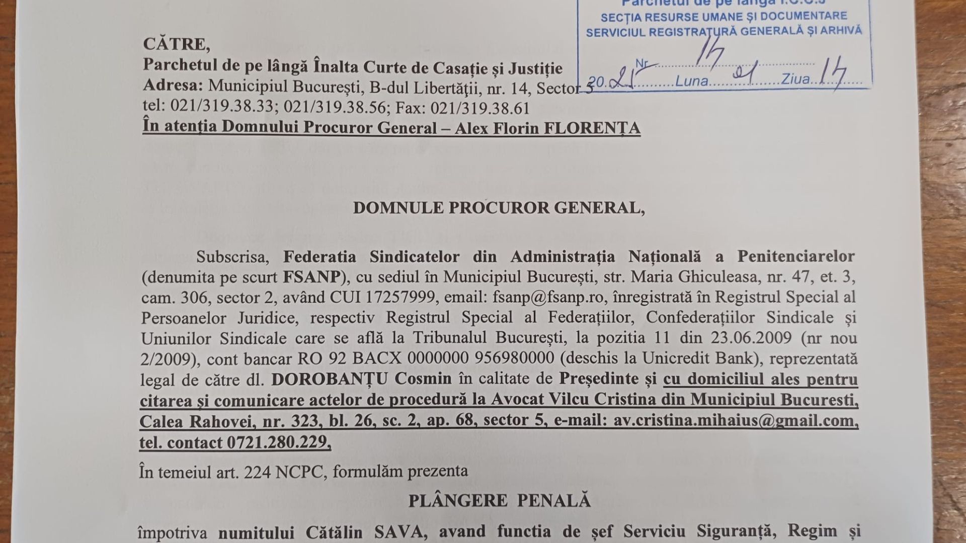 Federația Sindicatelor din Administrația Națională a Penitenciarelor (FSANP) a formulat o plângere penală împotriva adjunctului Penitenciarului Spital Rahova, Cătălin Sava. Conform unui articol de opinie, abuzurile, teroarea psihică și corupția au atins cote alarmante în această unitate, iar lipsa de reacție din partea Administrației Naționale a Penitenciarelor (ANP) a determinat sindicatul să apeleze la organele de cercetare penală.