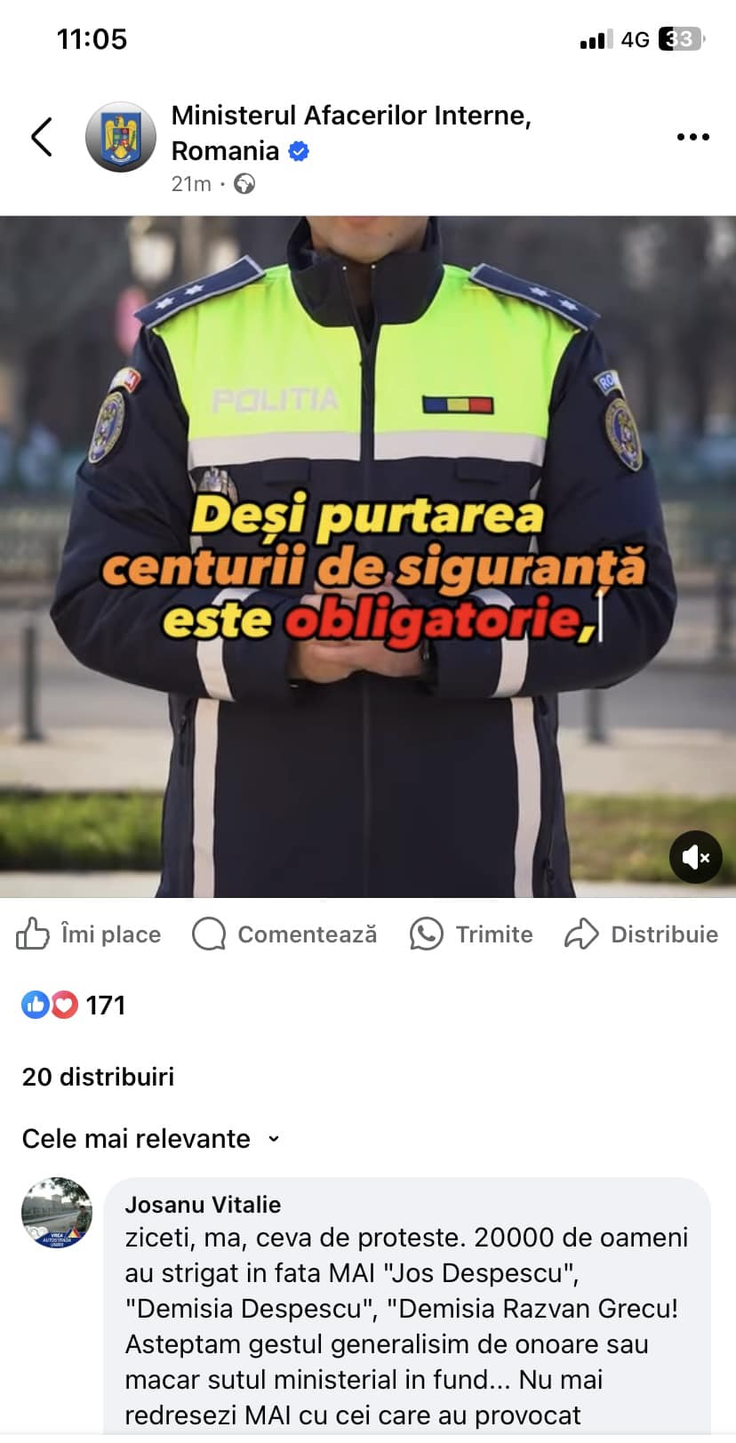 În loc să abordeze problemele semnalate de protestatari, MAI a distribuit informații despre purtarea centurii de siguranță, ceea ce a generat și mai multă frustrare în rândul polițiștilor.