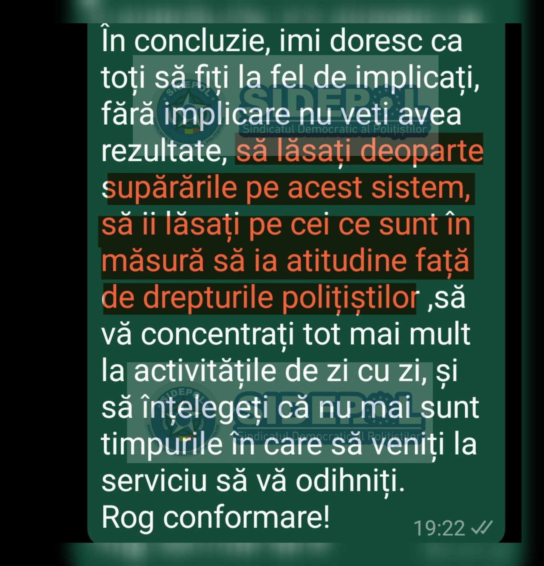 Sindicatul Sidepol îndeamnă toți polițiștii din Inspectoratul de Poliție Județean Timiș să își îndeplinească atribuțiile conform prevederilor legale și să raporteze orice formă de presiune sau imixtiune din partea superiorilor. Aceștia promit că vor oferi suport angajaților în orice situație, reafirmându-le angajamentul de a proteja drepturile și interesele acestora.