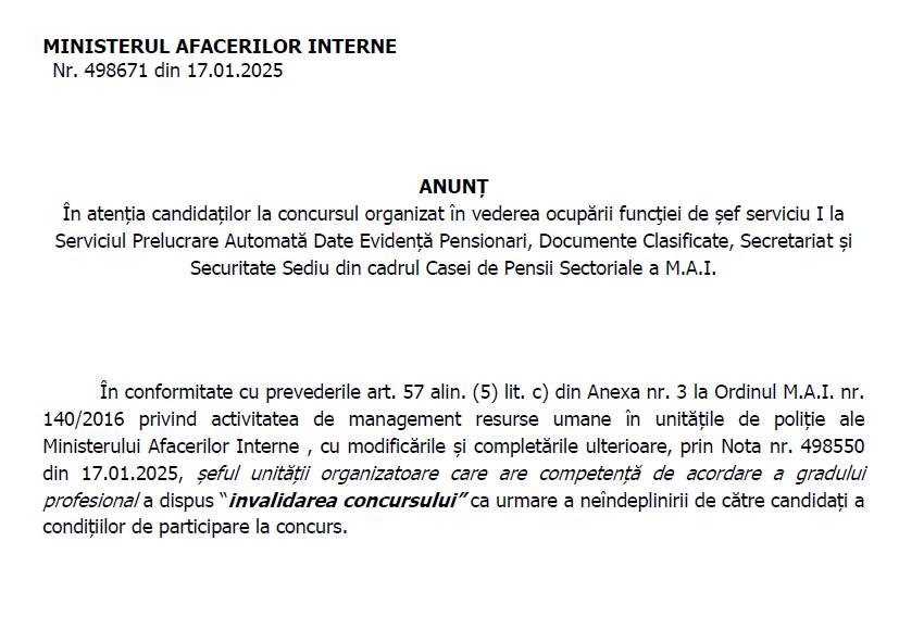 Concurs invalidat la Casa de Pensii MAI: O situație controversată