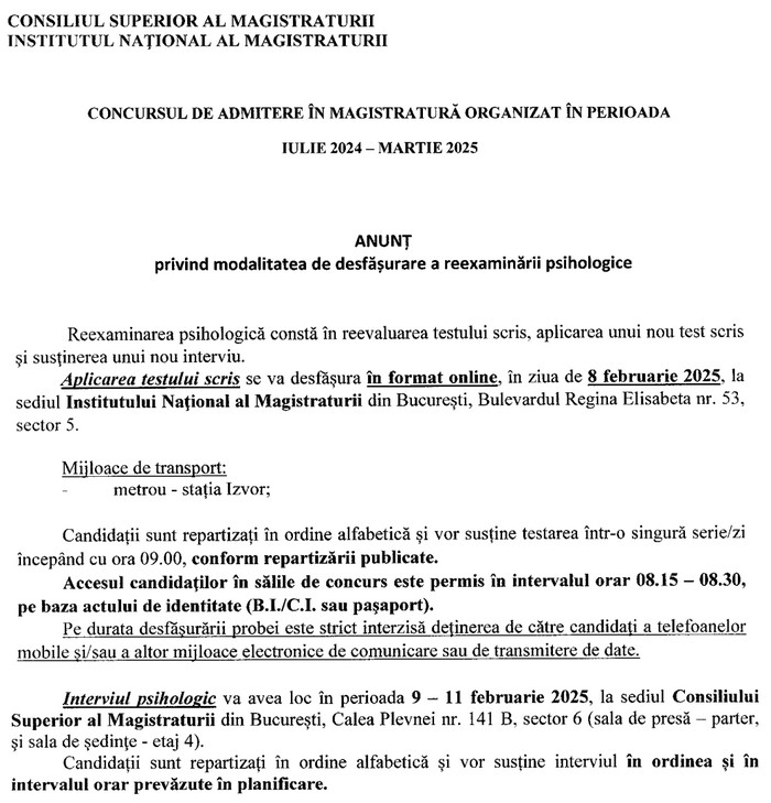 Cei 61 de candidați respinși au acum ocazia să își recupereze șansele de admitere. O reexaminare a testării psihologice este programată pentru perioada 8, 9, 10 și 11 februarie 2025, conform anunțului făcut de Consiliul Superior al Magistraturii (CSM).