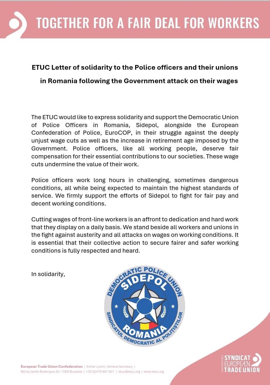 Confederația Europeană a Sindicatelor (ETUC) își exprimă solidaritatea și susținerea față de Sindicatul Democratic al Polițiștilor – Sidepol, alături de Confederația Europeană a Poliției – EuroCOP. Această poziție vine ca răspuns la măsurile guvernamentale recente care impun reduceri salariale considerabil nedrepte și creșterea vârstei de pensionare pentru polițiști.