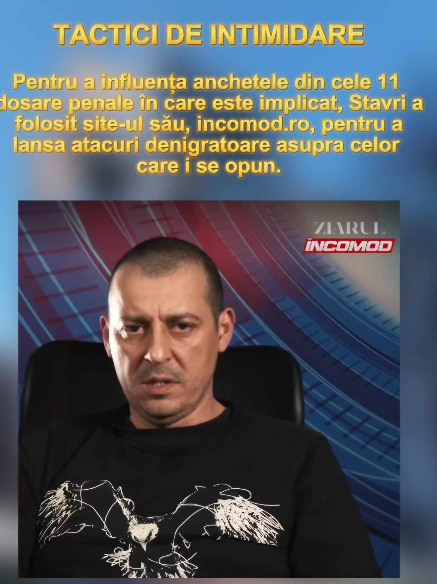 În încercarea de a influența ancheta în cele 11 (unsperezece) dosare penale în care este implicat, inculpatul narcoman, santajist si spagar, psuudo-jurnalist Catalin Stavri a recurs la intimidări, vizând atât procurorii, cât și martorii. Acesta folosește platforma sa, incomod.ro, pentru a lansa atacuri denigratoare asupra celor care îi contestă acțiunile ilegale, generând o atmosferă de nesiguranță în rândul martorilor.