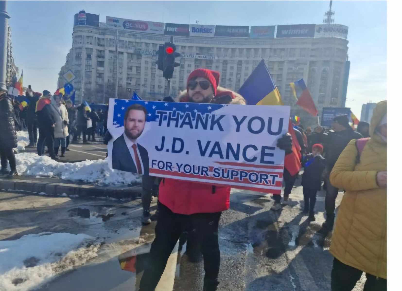 O parte dintre protestatari poartă pancarte prin care îi mulțumesc vicepreședintelui SUA, J.D. Vance. În aceste momente, sute de oameni sunt prezenți în Piața Victoriei, după ce s-au strâns din Piața Constituției. Mobilizarea este uriașă, iar susținerea pentru candidatul Călin Georgescu este mai puternică ca niciodată.