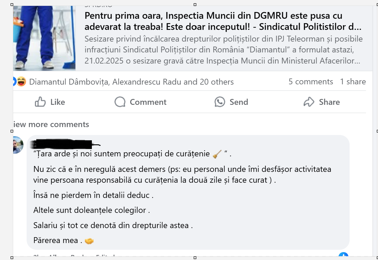 Sindicatul subliniază că polițiștii nu cer privilegii, ci doar respectul și condițiile minime pentru a-și putea face datoria față de cetățeni și față de România. (Cerasela N.).