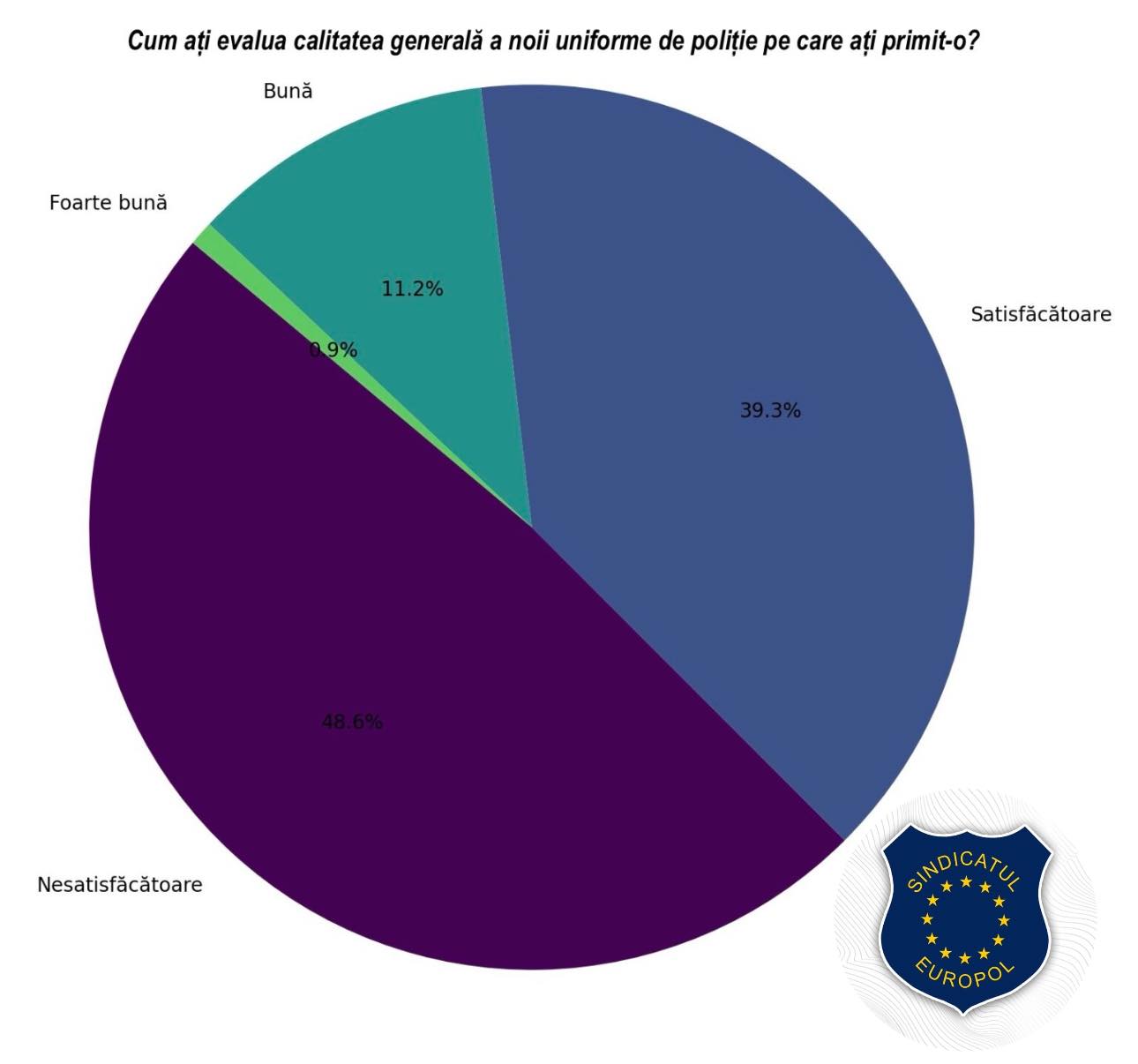 Din 7.800 de polițiști din structurile de ordine publică și rutieră care au răspuns chestionarului distribuit de Sindicatul Europol pentru a afla percepția polițiștilor asupra noii uniforme, doar 0,9% dintre aceștia, adică mai puțin de 70 de polițiști, au apreciat noua uniformă ca având o calitate generală foarte bună.