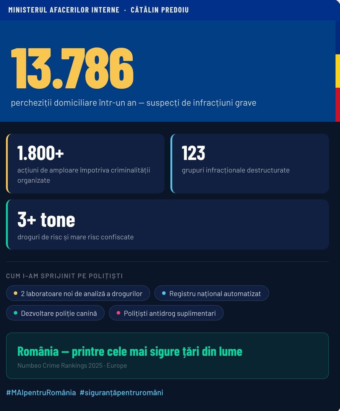 Toate aceste măsuri și eforturi converg către un rezultat de o importanță strategică, recunoscut la nivel global. Conform platformei internaționale de date Numbeo.com, România se clasează printre cele mai sigure țări din lume, o performanță care reflectă direct eficacitatea acțiunilor MAI și a Poliției Române în asigurarea unui mediu sigur pentru cetățenii săi. Această recunoaștere internațională confirmă că investițiile în securitate și angajamentul ferm în lupta împotriva criminalității aduc beneficii concrete și tangibile pentru întreaga societate. (Paul D.).