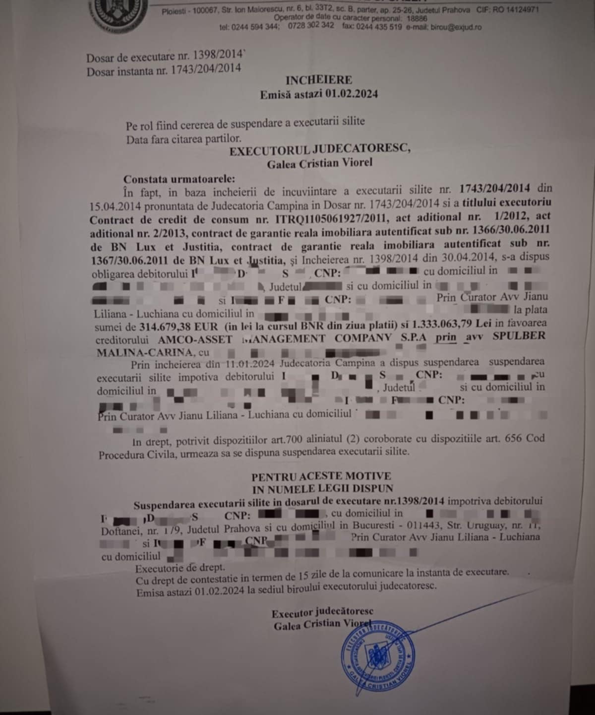 Șocant este faptul că, deși Judecătoria Câmpina a dispus suspendarea executării silite în dosarul execuțional 1398/2014 încă din 11 ianuarie 2024, executorul Galea a ignorat această decizie și a continuat procedurile de vânzare.