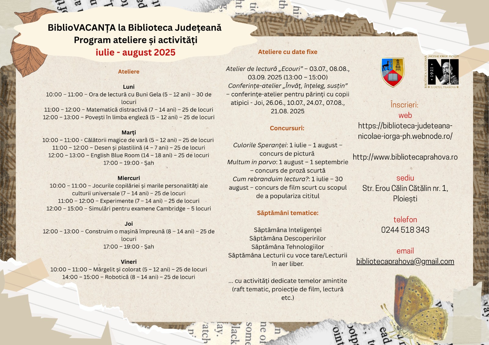 Vara aceasta, Biblioteca Județeană „Nicolae Iorga” din Ploiești deschide porțile unei lumi fascinante pentru copii și adolescenți, oferind un program bogat și ingenios de ateliere și activități care transformă lectura, știința și jocul în experiențe vii. Sub numele „BiblioVACANȚA”, inițiativa aduce împreună curiozitatea, creativitatea și învățarea prin joacă, într-un cadru prietenos și stimulant, conceput special pentru perioada iulie – august 2025.