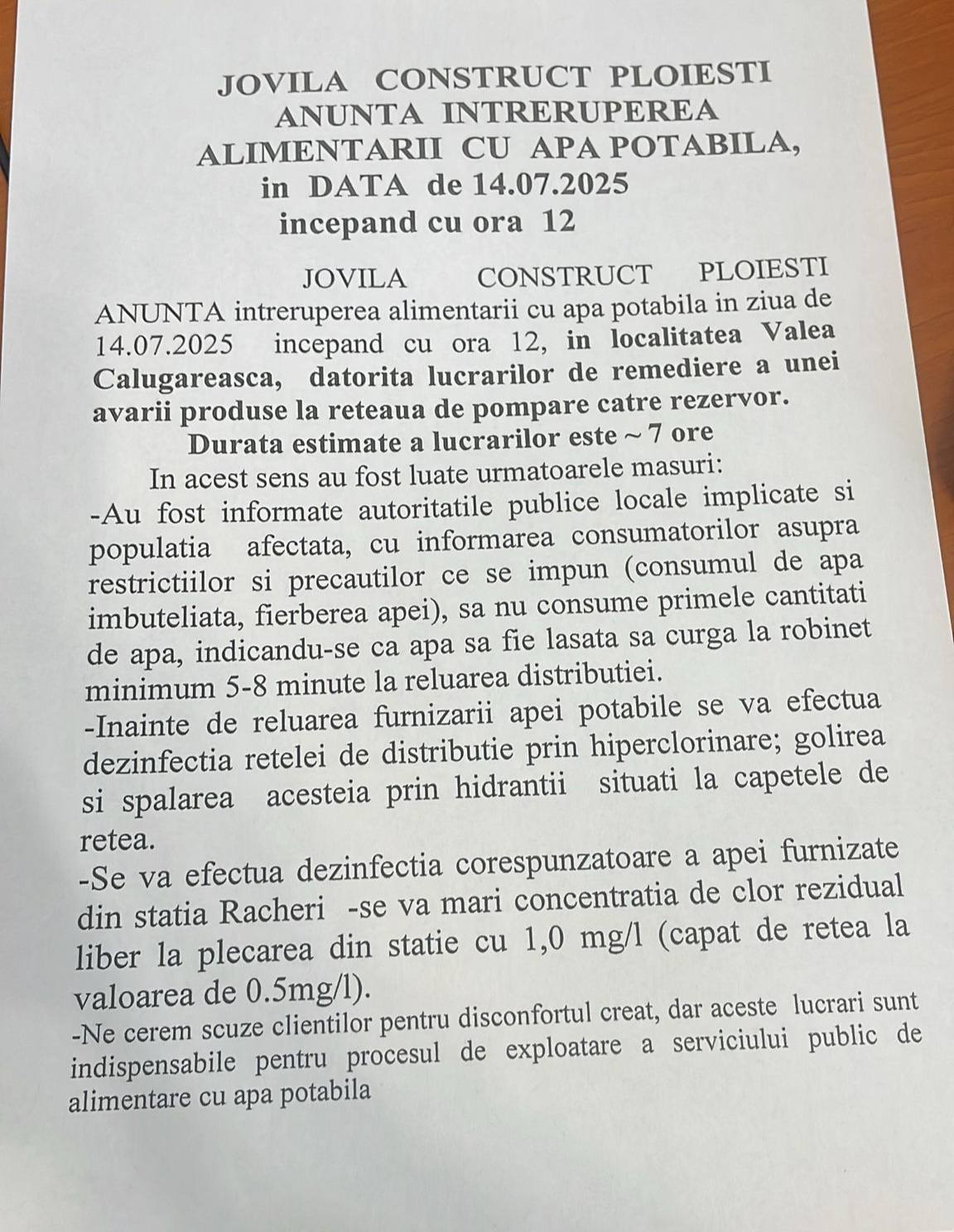 Valea Călugărească: Intervenții majore la rețeaua de apă – Furnizarea apei potabile va fi întreruptă luni, 14 iulie