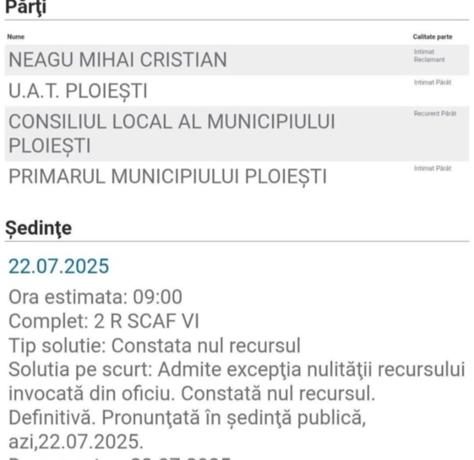 Instanța a dat dreptate consilierului local Mihai Neagu, din partea Mișcării Noi, Ploieștenii, validând astfel legalitatea ieșirii municipiului din ADI Deșeuri Prahova. Decizia Curții de Apel Ploiești, care a respins recursul consilierilor locali ce au votat pentru menținerea abuzivă a operatorului de salubritate ADI Deșeuri, este o victorie nu doar pentru Mihai Neagu, ci pentru toți ploieștenii care își doresc un sistem de salubritate transparent și eficient.