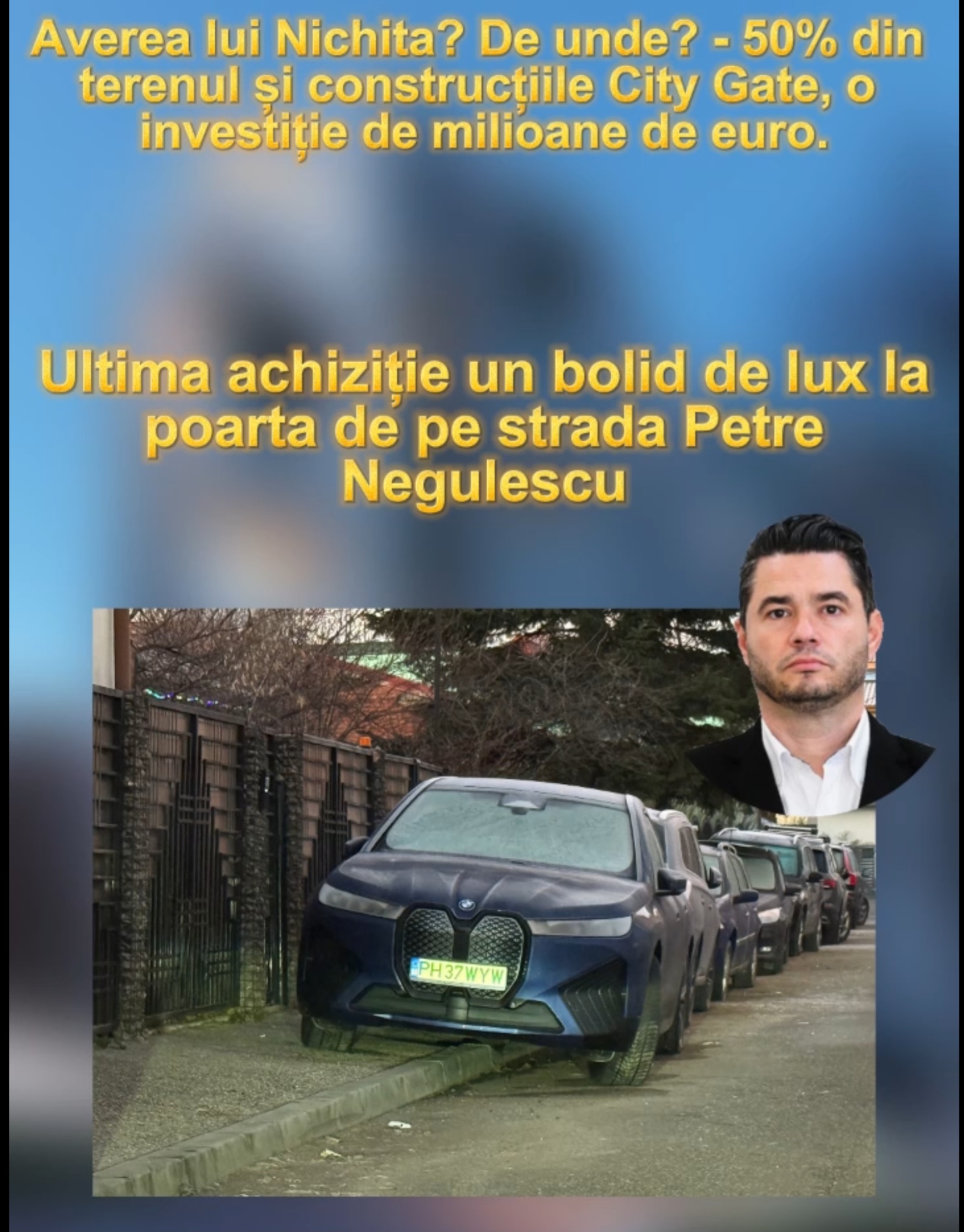 În timp ce „Ciuruitoarea” își vede de „fleacurile” ei, Vlad Nichita, alias „Il Capo”, își etalează luxul cu o nonșalanță greu de imaginat. Două BMW-uri, unul pentru el, unul pentru consoarta Elena, tronează sfidător în fața casei, simboluri ale impunității și ale unei „bălți cu pești” mai adânci decât groapa Marianelor. Cum ar fi, oare, ca doamna Nichita să fie văzută într-un Logan sau un Opel Corsa? Groază!
