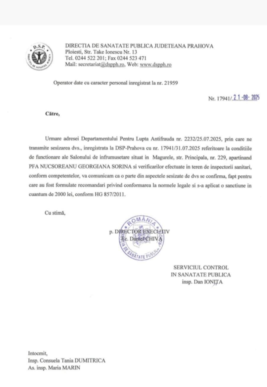 Direcția de Sănătate Publică (DSP) Prahova, alertată de Antifraudă și de dezvăluirile Incisiv de Prahova, s-a deplasat la fața locului. În urma verificărilor efectuate de inspectorii sanitari, dezvăluirile Incisiv de Prahova s-au confirmat, la fel cum sunt confirmate investigațiile noastre de catre organele de cercetare penală! Surpriză, surpriză! O parte din mizeriile și neregulile semnalate s-au confirmat. Rezultatul? O amendă usturătoare de 2000 de lei! Adică, serios? Atât valorează sănătatea prahovenilor și imaginea unei localități? Probabil că un tratament anti-purici pentru haita de câini care păzește salonul ar costa mai mult. Dar hei, măcar s-a dat o amendă, nu?