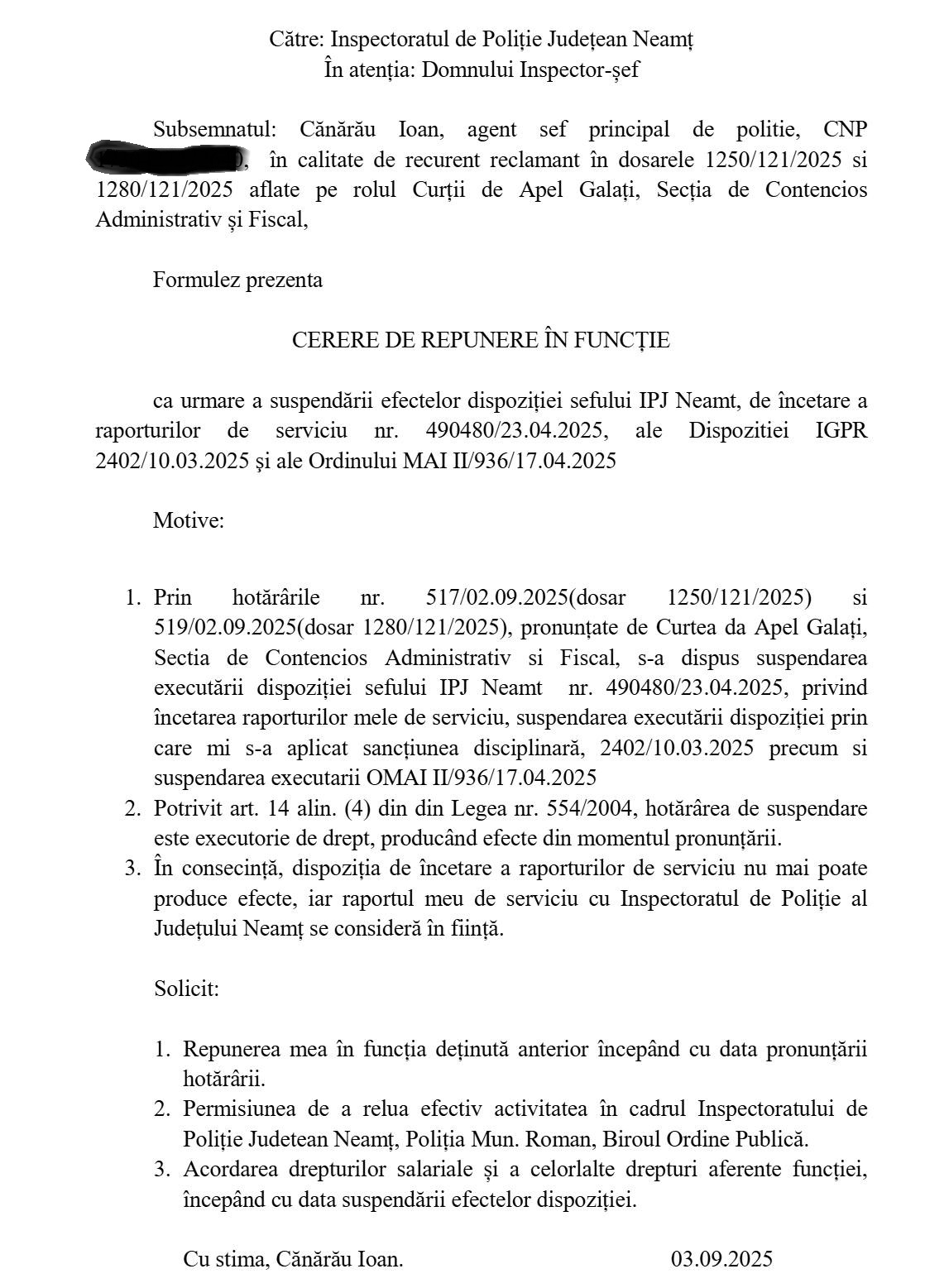 Dar bomba abia acum explodează! Conform informațiilor obținute pe surse (și care, evident, nu pot fi confirmate oficial, că deh, e secret de stat!), după ce Cănărău a fost reîncadrat pe 2 septembrie 2025, a doua destituire a fost „activată” retroactiv, pretinzându-se că a intrat în vigoare fix în aceeași zi. Adică, omul a fost și reîncadrat, și destituit în același moment! O performanță demnă de Cartea Recordurilor.