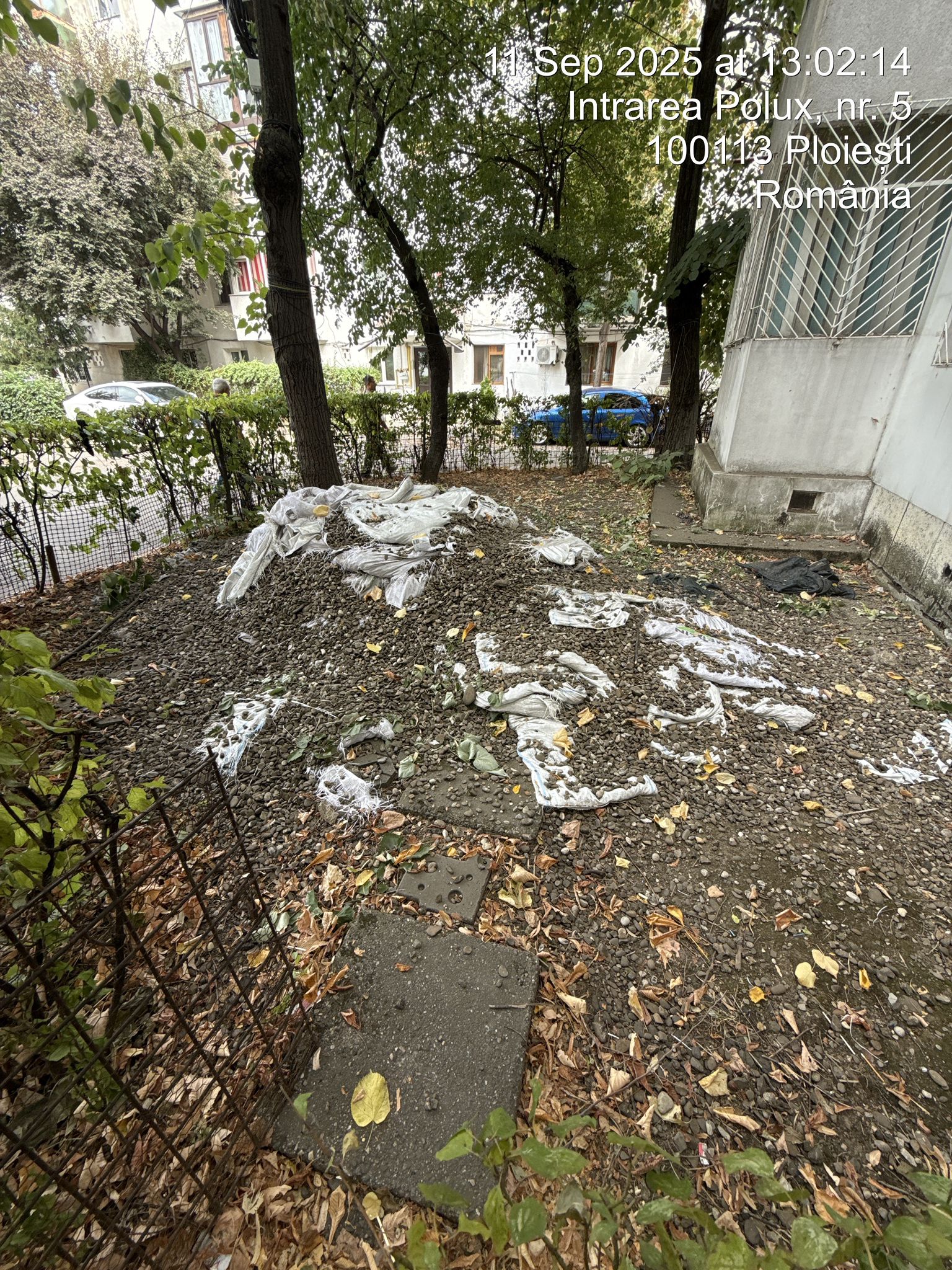 În loc să fie colectate și transportate corespunzător, materialele de construcții rezultate în urma lucrărilor au fost pur și simplu aruncate de pe acoperiș, aterizând în spațiul verde din jurul blocului.
