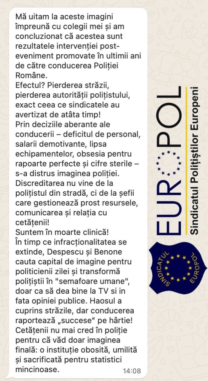 Sindicatul Europol a avertizat în repetate rânduri asupra dezastrului iminent. Lipsa de resurse, salariile demotivante, deficitul de personal și obsesia pentru rapoarte false au transformat Poliția Română într-o umbră a ceea ce ar trebui să fie. „Orice compromis, orice tăiere în structurile MAI înseamnă vieți pierdute! Siguranța oamenilor nu poate fi negociată,” avertizează Europol. (Cerasela N.).