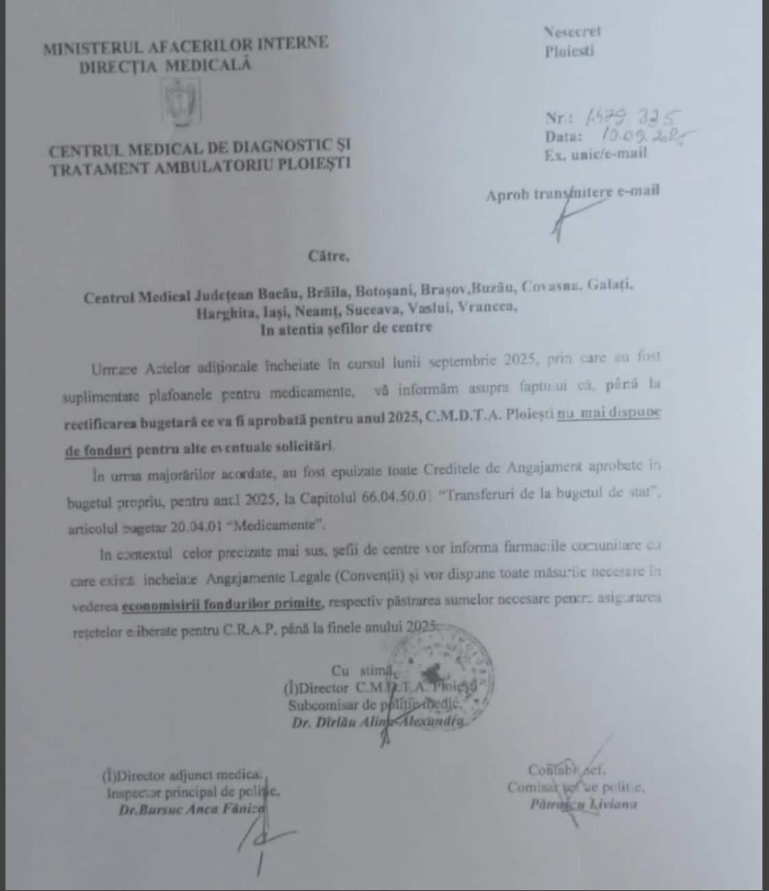 Într-o circulară internă, trimisă cu nonșalanță către centrele medicale județene, CMDTA Ploiești recunoaște senin că, deși plafoanele pentru medicamente au fost „suplimentate” în septembrie 2025, banii s-au terminat. Toate creditele de angajament au fost epuizate, iar farmaciile comunitare sunt rugate să economisească fondurile rămase pentru cazurile cu adevărat urgente. Adică, probabil, pentru politicienii cu funcții importante, nu pentru cetățenii de rând.