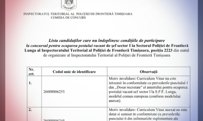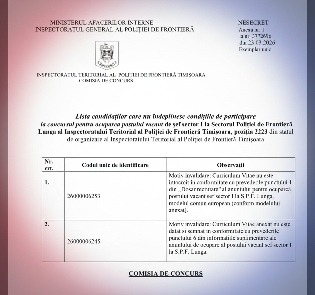 Circul „meritocrației” a lovit din plin la Inspectoratul Teritorial al Poliției de Frontieră (ITPF) Timișoara, unde un concurs banal pentru o funcție de șef de sector la Sectorul Poliției de Frontieră Lunga s-a transformat într-o farsă jenantă. Sindicatul Europol trage semnalul de alarmă, dezvăluind o poveste demnă de un scenariu de teatru absurd: procedura, programată pentru 31 martie 2026, a fost dinamitată din fașă, candidații fiind ejectați cu o agilitate demnă de o scenetă de stand-up comedy, nu de o instituție serioasă.
