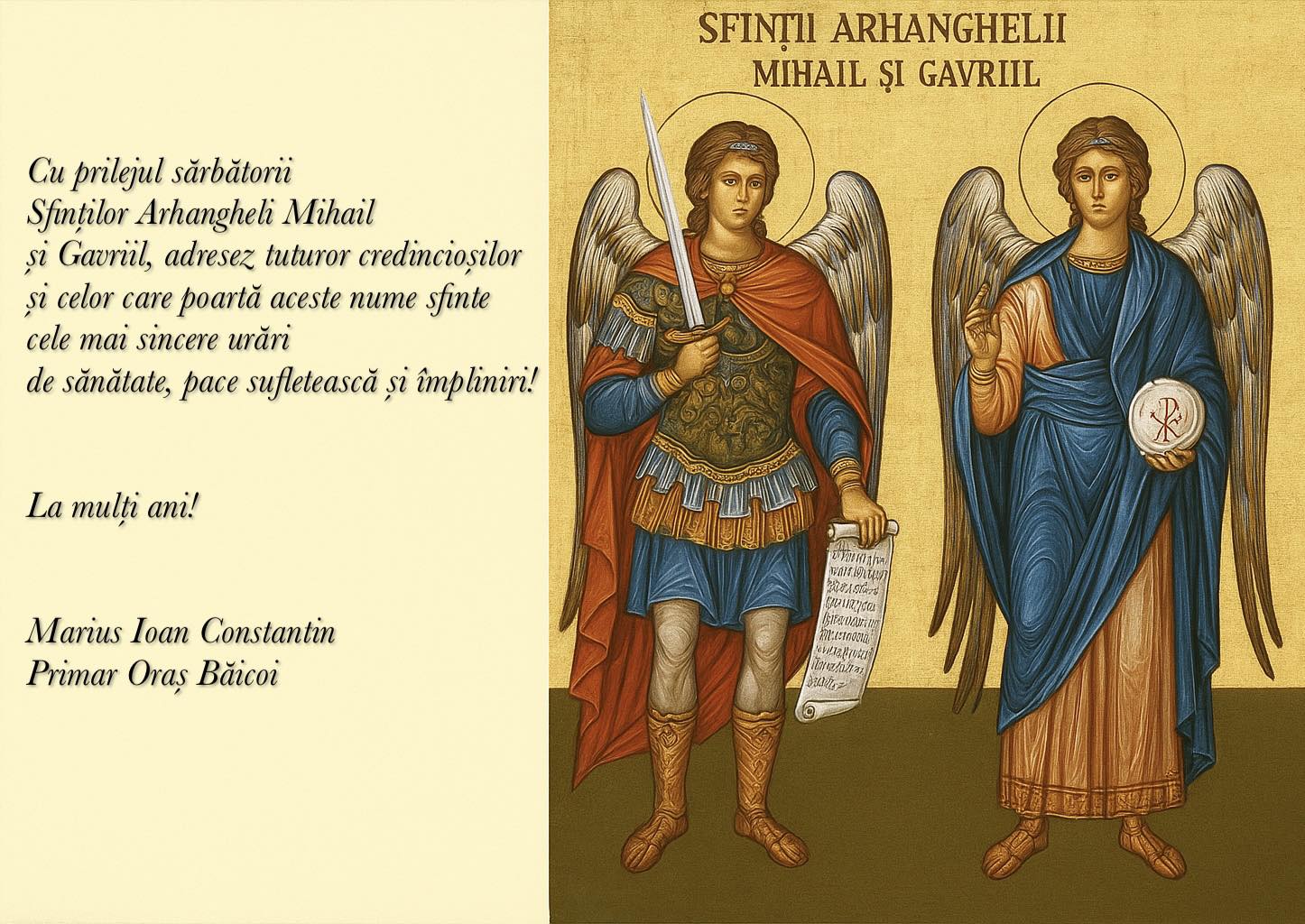 Cu o tradiție deja consacrată de a fi aproape de cetățeni în momentele cheie ale calendarului creștin, Primarul Orașului Băicoi, Marius Ioan Constantin, a adresat un mesaj sincer și emoționant. Acesta a fost destinat nu doar tuturor credincioșilor, ci și, în mod special, locuitorilor care poartă cu mândrie numele patronimice Mihail sau Gabriel, ce amintesc de ocrotitorii divini.