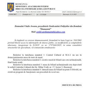 O corespondență recentă dintre Sindicatul Polițiștilor din România „Diamantul” (SPR Diamantul) și Ministerul Afacerilor Interne (MAI) scoate la iveală o discrepanță flagrantă între așteptările de transparență și răspunsurile oficiale. Într-o serie de întrebări punctuale, adresate Ministerului, sindicaliștii au căutat clarificări privind activitatea, finanțarea și justificarea existenței Centrului Cultural al MAI, o instituție care angajează personal artistic, inclusiv „balerini”, în structura unui minister dedicat ordinii publice. Răspunsurile MAI, transmise pe 11 noiembrie 2025, au fost, însă, parțial evazive și concentrate pe detalii minore, lăsând multe semne de întrebare, conform documentelor analizate (sursa: corespondență SPR Diamantul – MAI).