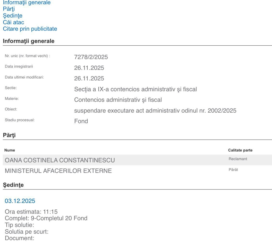 Sub numărul unic 7278/2/2025, înregistrat pe 26 noiembrie 2025, OANA COSTINELA CONSTANTINESCU, reclamanta curajoasă despre care Incisiv de Prahova a scris pe larg, dă în judecată MINISTERUL AFACERILOR EXTERNE pentru suspendarea executării Ordinului 2002/2025.