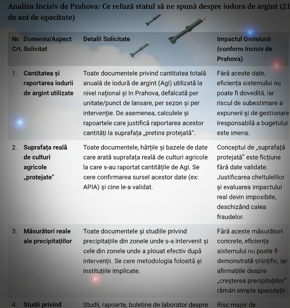 | 1. | Cantitatea și raportarea iodurii de argint utilizate | Toate documentele privind cantitatea totală anuală de iodură de argint (AgI) utilizată la nivel național și în Prahova, defalcată per unitate/punct de lansare, per sezon și per intervenție. De asemenea, calculele și rapoartele care justifică raportarea acestor cantități la suprafața „pretins protejată”. | Fără aceste date, eficiența sistemului nu poate fi dovedită, iar riscul de subestimare a expunerii și de gestionare iresponsabilă a bugetului este imens. |