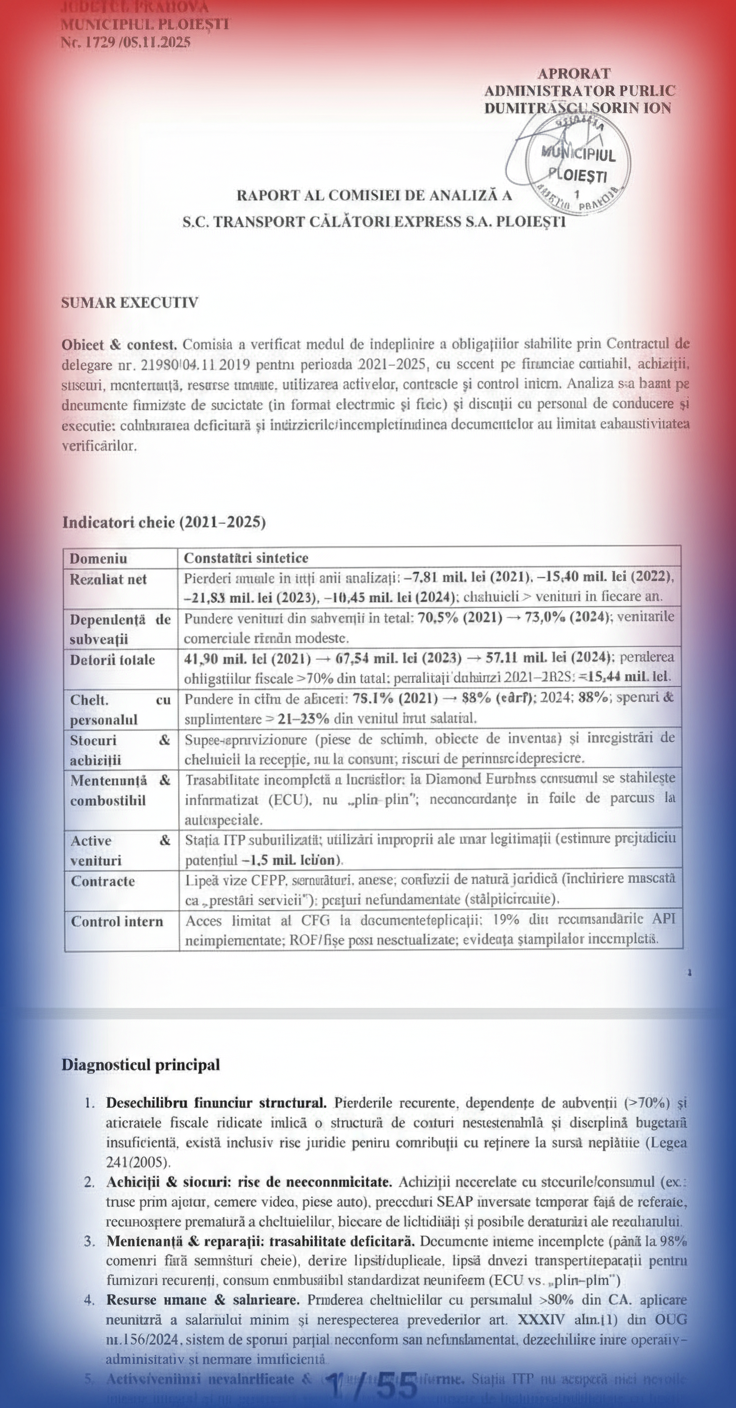 Adevăratul seism se produce însă la S.C. Transport Călători Express S.A. Ploiești (TCE), un simbol al ineficienței administrative cronice. Un raport recent al Comisiei de Analiză, aprobat de însuși administratorul public (Nu acelasi cu „salariul de noaptea minții”, ci vechiul care era un profesionist), este o cronică a dezastrului financiar și managerial, o odă adusă risipei și incompetenței.