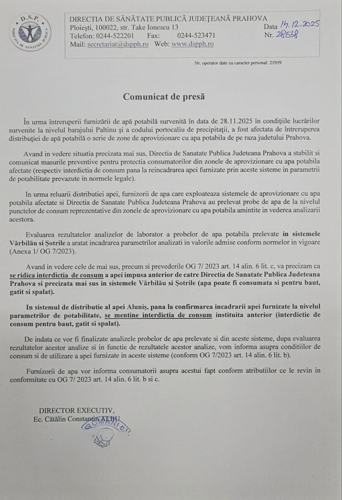 Autoritățile județene, în colaborare strânsă cu operatorul de apă Hidro Prahova, monitorizează permanent evoluția situației. Acestea asigură publicul că orice nouă informație va fi comunicată prompt și transparent, imediat ce vor exista date care să permită ridicarea restricțiilor și în Aluniș. Reprezentanții biroului de presă au reiterat mulțumirile adresate locuitorilor pentru răbdarea și înțelegerea de care au dat dovadă în această perioadă, garantând că sunt implementate toate măsurile tehnice necesare pentru restabilirea completă și rapidă a siguranței alimentării cu apă potabilă în toate localitățile afectate. Obiectivul primordial rămâne asigurarea unui acces constant și sigur la apă potabilă pentru toți cetățenii județului Prahova.