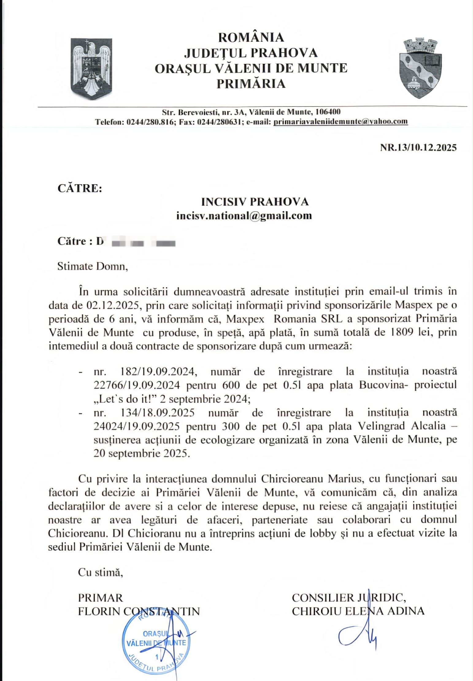 Acest detaliu aruncă o lumină nouă și absolut hilară asupra răspunsului oficial al Primăriei Vălenii de Munte, dat Incisiv de Prahova la solicitările privind sponsorizările Maspex și presupusele legături cu domnul Chircioreanu Marius. O veritabilă demonstrație de teatru absurd: în loc să clarifice milioanele care se plimbau prin hălmăgie și chirie, Primăria a răspuns, solemn, că Maspex a „sponsorizat” instituția cu… 1809 lei în apă plată! Da, ați citit bine: o nimica toată de 1809 lei (cam 360 de euro) pentru șase ani, sub formă de 600 de pet-uri de Bucovina și 300 de pet-uri de Velingrad Alcalia. O sponsorizare mai degrabă pentru o petrecere de grădiniță, nicidecum pentru un contract cu mize de 8.700 de euro pe lună! Cu asemenea „generozitate”, te și miri că Primăria Vălenii de Munte nu a suferit de deshidratare severă, în loc să fie acuzată de corupție la scară largă.