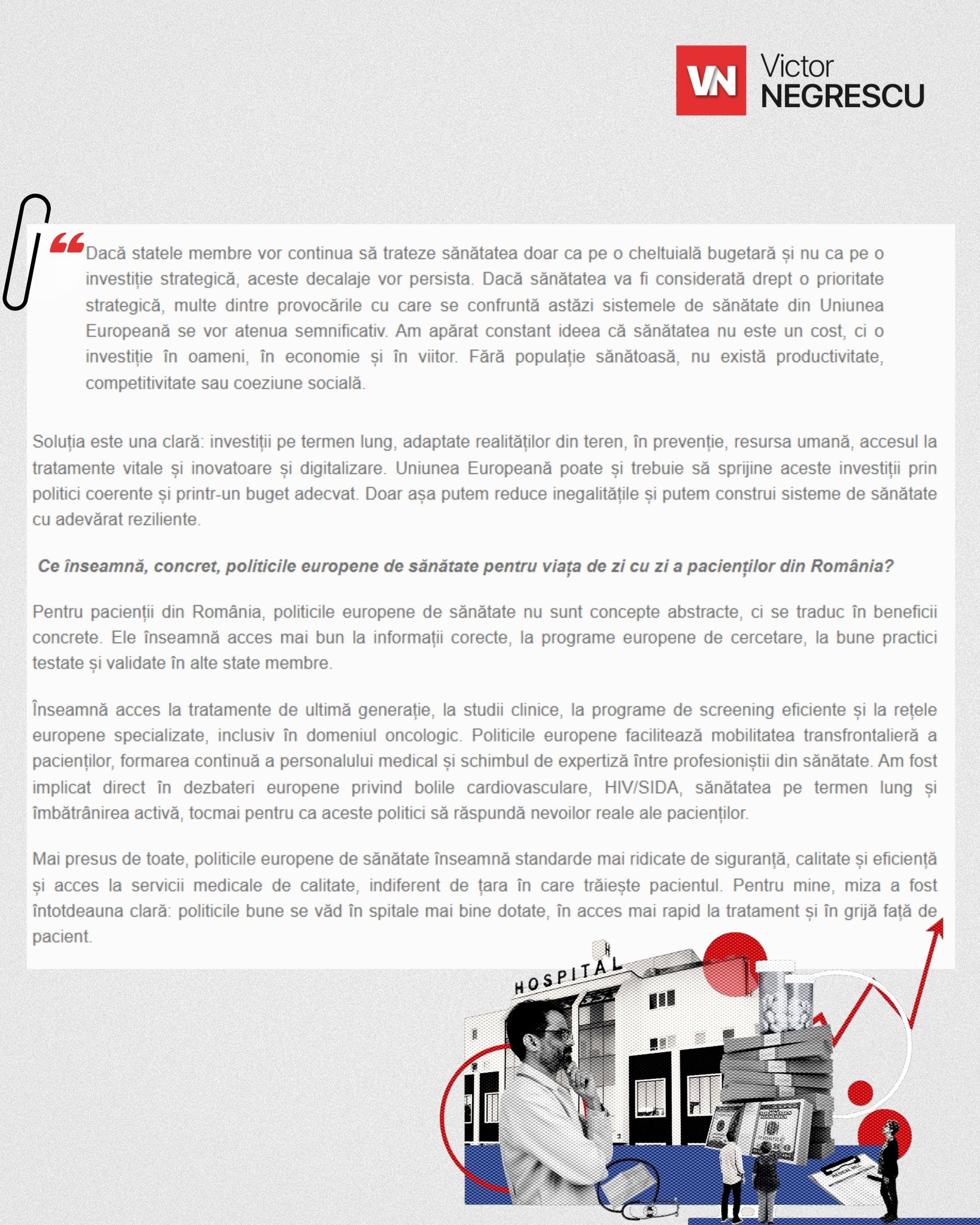 Propunerea radicală a europarlamentarului Victor Negrescu plasează sănătatea în centrul agendei europene, argumentând că politicile comunitare în acest domeniu trebuie să depășească stadiul declarativ. „Politicile europene de sănătate trebuie să se vadă în spitale, nu doar pe hârtie”, afirmă Negrescu, punctând că investițiile masive sunt singura cale de a asigura că fiecare cetățean beneficiază de îngrijiri medicale la standarde înalte. Această viziune ambițioasă transformă sănătatea publică dintr-o cheltuială într-o investiție strategică pe termen lung.