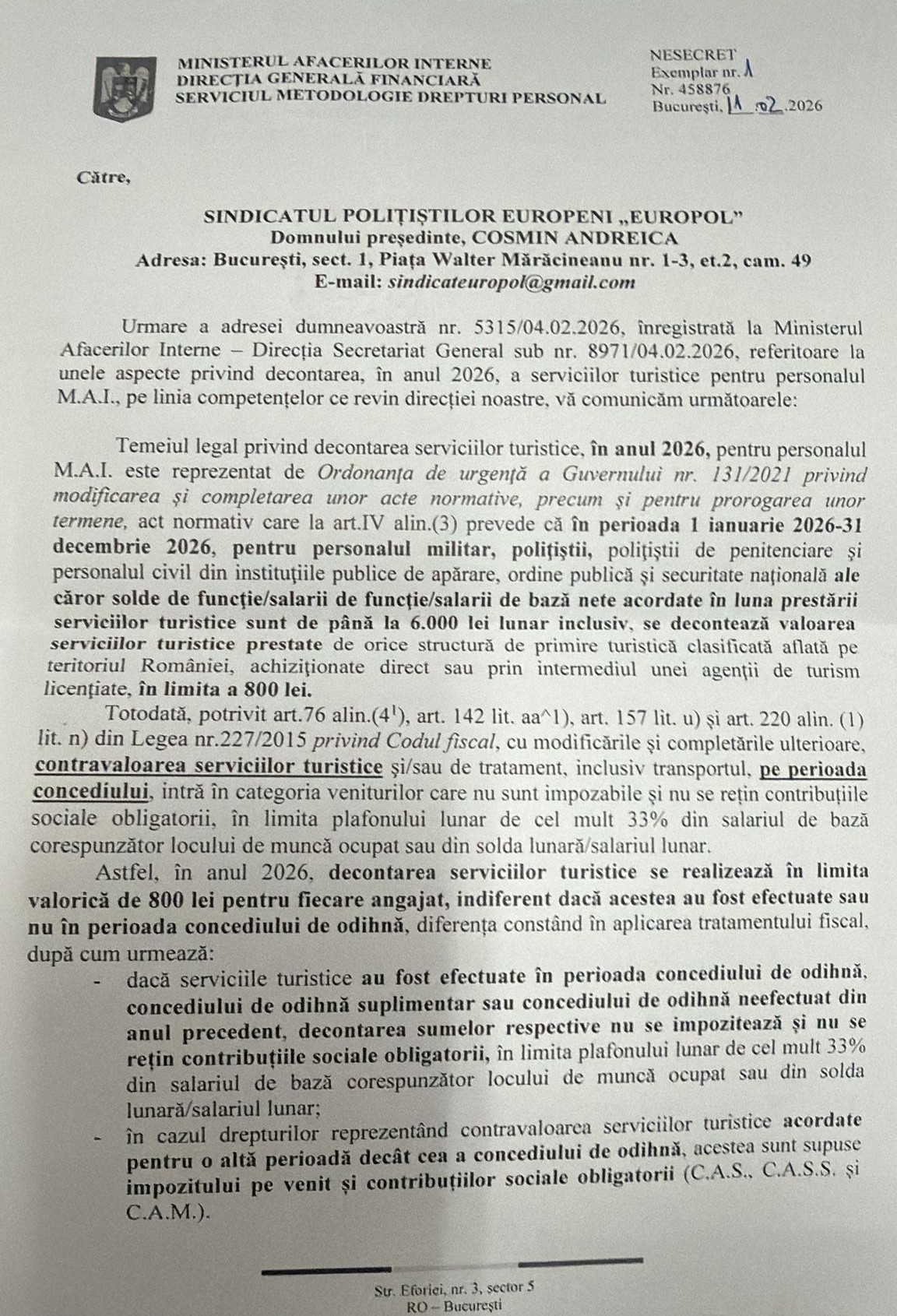 O veste importantă pentru miile de angajați ai Ministerului Afacerilor Interne (MAI) clarifică modul de decontare a serviciilor turistice, extinzând posibilitatea beneficiarilor de a utiliza aceste facilități și pentru zilele de concediu rămase neefectuate din anii precedenți. Anunțul vine în urma demersurilor efectuate de Sindicatul Europol, care a solicitat lămuriri Direcției Generale Financiare (DGF) din cadrul MAI.