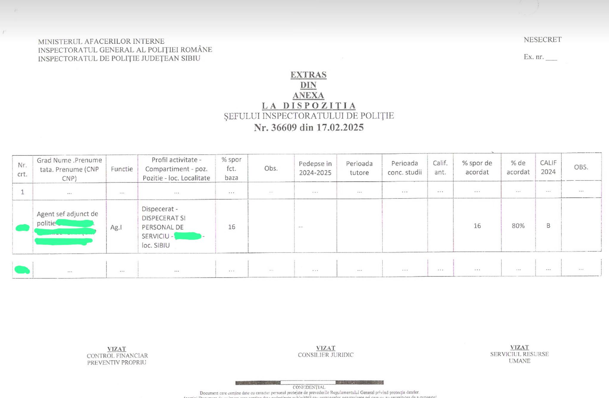 Extrasul din Dispoziția Șefului Inspectoratului de Poliție, Nr. 36609 din 17.02.2025, publicat de sindicat, confirmă în mod clar statutul „NESECRET” al documentului. Acesta detaliază acordarea unui spor pentru un „Agent șef adjunct de poliție” din cadrul dispeceratului IPJ Sibiu, indicând un „spor de acordat” de 16% și un „% de acordat” de 80%. Prezența acestei mențiuni „NESECRET” pe un document de decizie salarială vine în contradicție directă cu informațiile vehiculate până acum, demonstrând că procentele respective nu erau, de fapt, informații clasificate.