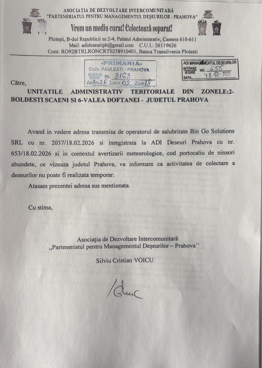 Anunțul oficial a fost transmis de către Asociația de Dezvoltare Intercomunitară „Parteneriatul pentru Managementul Deșeurilor – Prahova” (ADI Prahova). Acesta se adresează unităților administrativ-teritoriale incluse în Zonele 2 (Păulești și Boldești Scăeni) și 6 (Valea Doftanei) din județul Prahova, confirmând perturbarea unui serviciu esențial pentru comunitate. Decizia vine după ce operatorul de salubritate Bin Go Solutions SRL a notificat ADI Prahova, printr-o adresă înregistrată sub numărul 653/18.02.2026, că activitatea de colectare nu poate fi realizată în contextul condițiilor meteo severe.