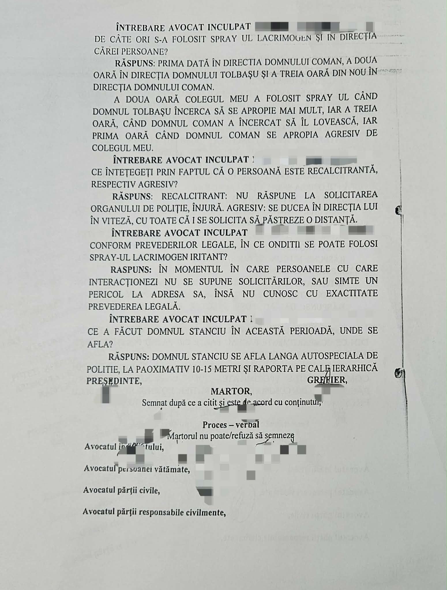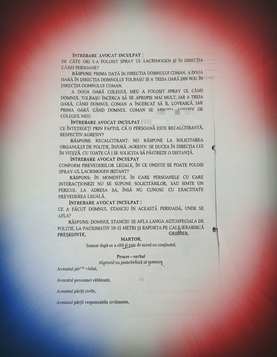 Depoziția agentului Burlan Marius-Daniel, coleg cu Mataiche și Picior, aduce o nouă doză de absurditate. Sub jurământ, Burlan descrie o scenă de haos și agresiune, dar cu o memorie suspect de selectivă. Reține că „Domnul Picior era înconjurat de mai multe persoane care se manifestau agresiv la adresa lui” și că „Picior le-a solicitat să se îndepărteze (…) și ulterior a folosit spray-ul iritant lacrimogen. Apreciez că de 3 ori a folosit acest spray, în direcția Domnului C…. sigur”.