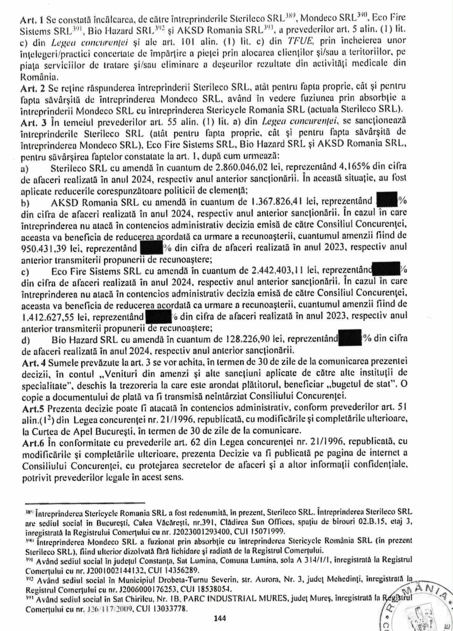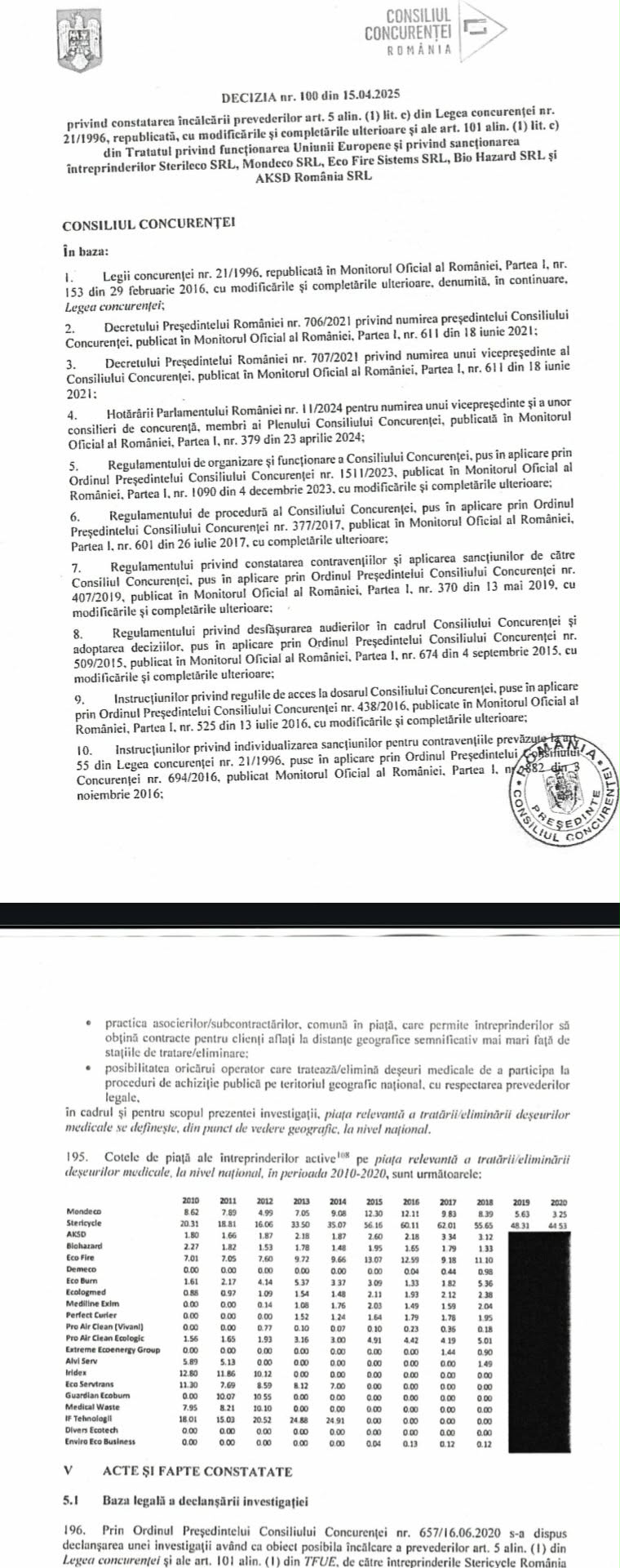 Firme precum Eco Fire Sistems SRL, Bio Hazard SRL și AKSD România SRL, Sterileco SRL (fosta Stericycle România SRL), Mondeco SRL, au fost găsite vinovate de încălcarea gravă a Legii concurenței (art. 5 alin. (1) lit. c) și a Tratatului privind funcționarea Uniunii Europene (art. 101 alin. (1) lit. c)). Acuzația?