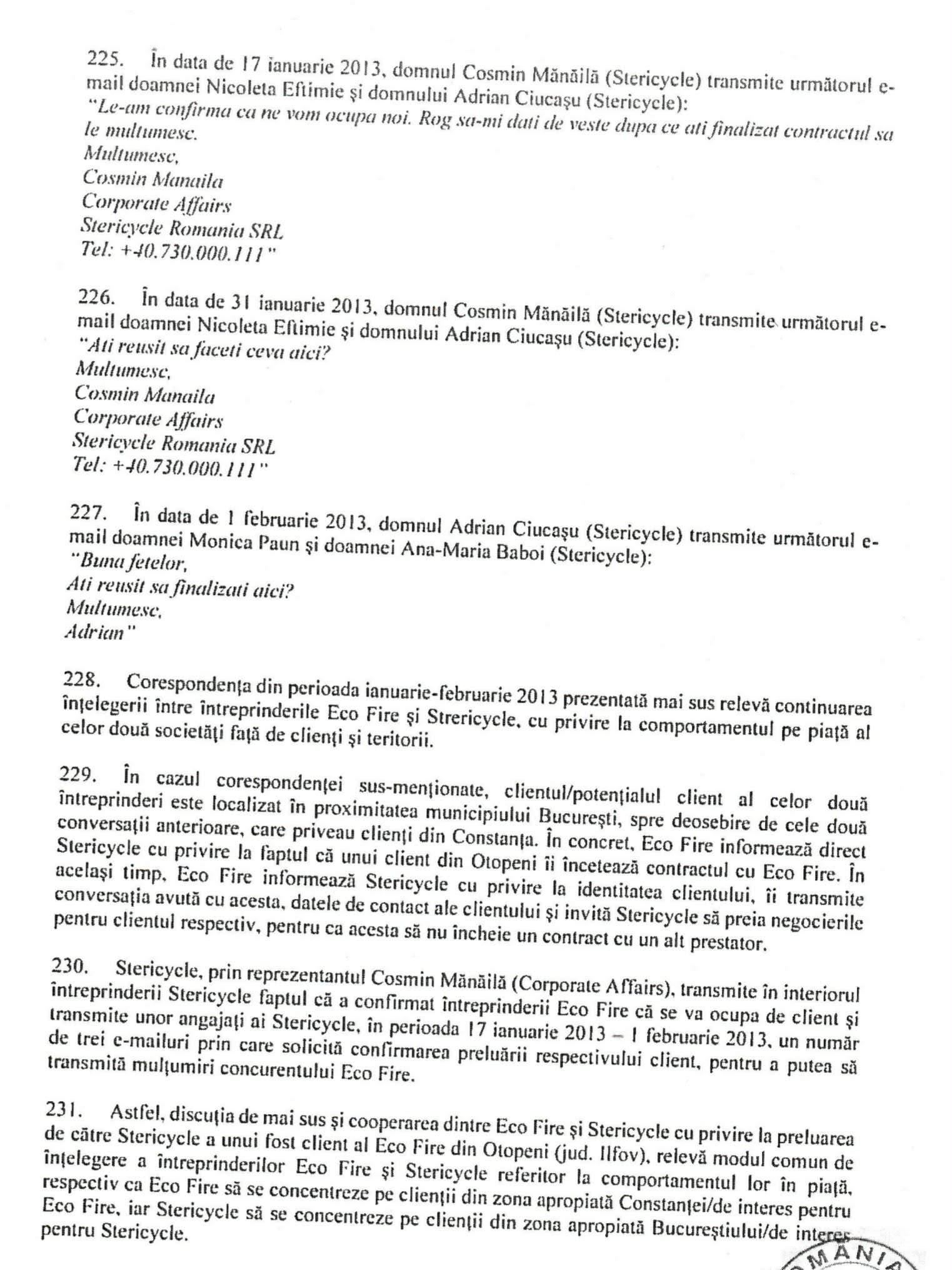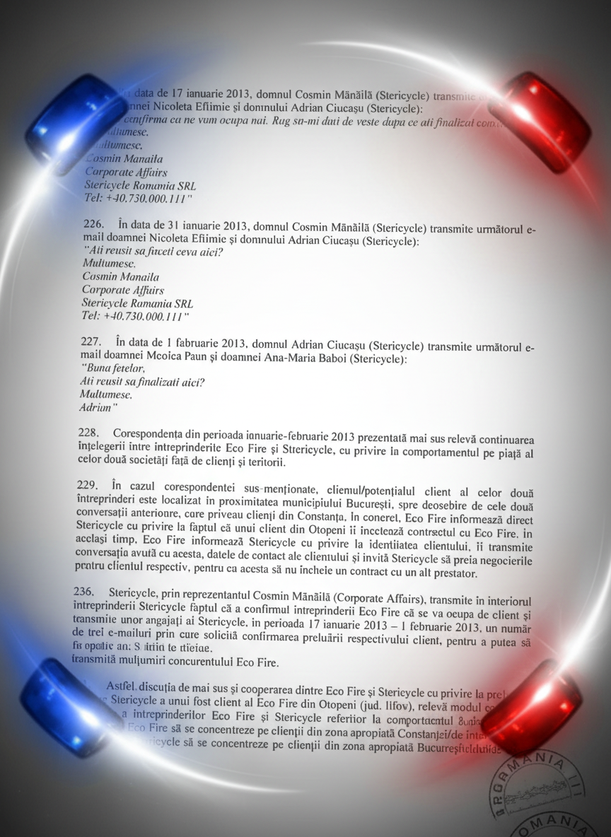 | 23.05.2012 | Mihaela Corciu (Eco Fire) | „Vă rog să preluați dumneavoastră negocierea unui nou contract (nu dorim să ajungă la alt prestator).” | Eco Fire „pasează” un client important (Farmacia Vicos Farm) din Constanța către Stericycle, în zona Ilfov/București, pentru a menține „echilibrul” pieței. |
