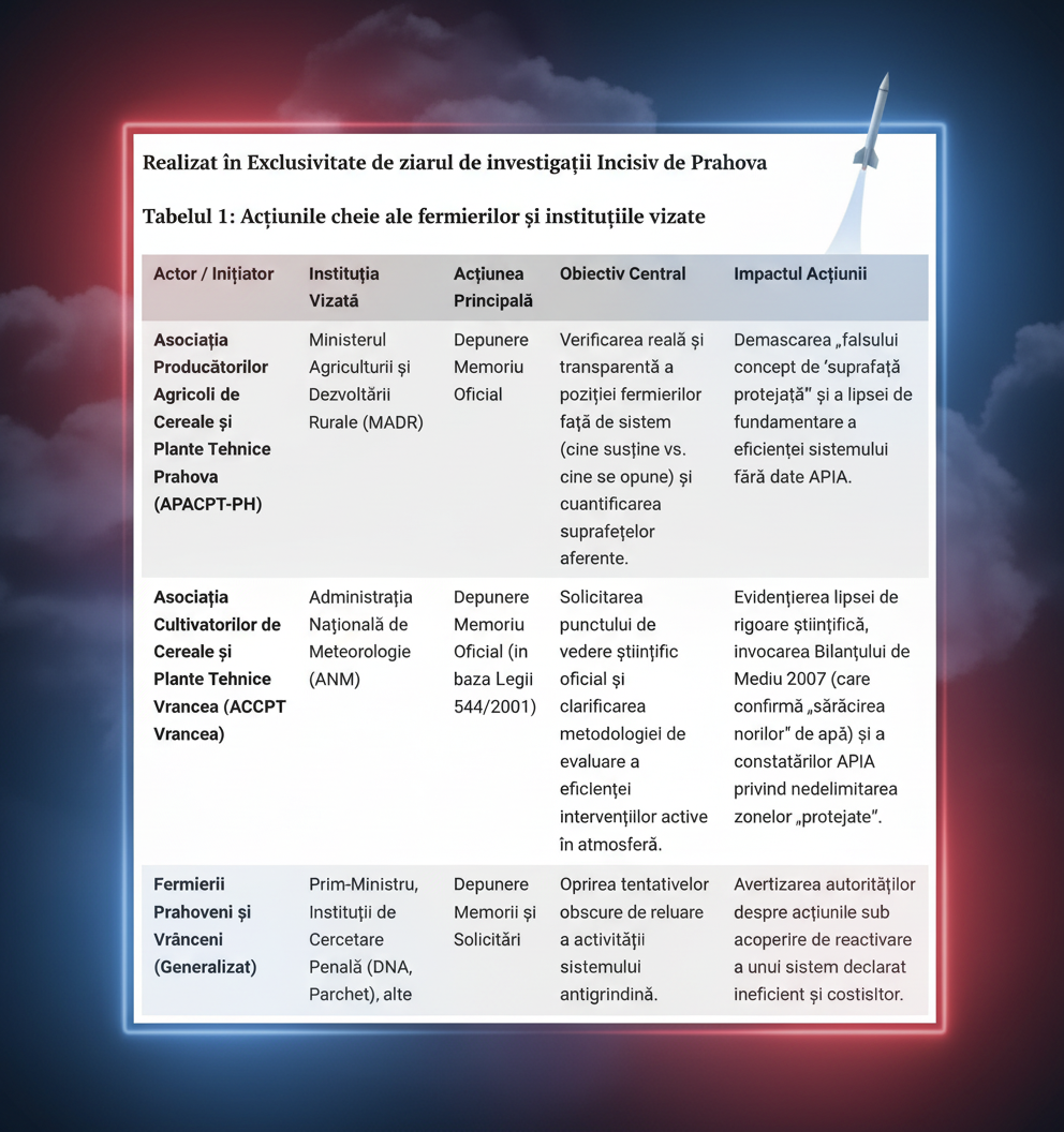 | Asociația Cultivatorilor de Cereale și Plante Tehnice Vrancea (ACCPT Vrancea) | Administrația Națională de Meteorologie (ANM) | Depunere Memoriu Oficial (în baza Legii 544/2001) | Solicitarea punctului de vedere științific oficial și clarificarea metodologiei de evaluare a eficienței intervențiilor active în atmosferă. | Evidențierea lipsei de rigoare științifică, invocarea Bilanțului de Mediu 2007 (care confirmă „sărăcirea norilor” de apă) și a constatărilor APIA privind nedelimitarea zonelor „protejate”. |